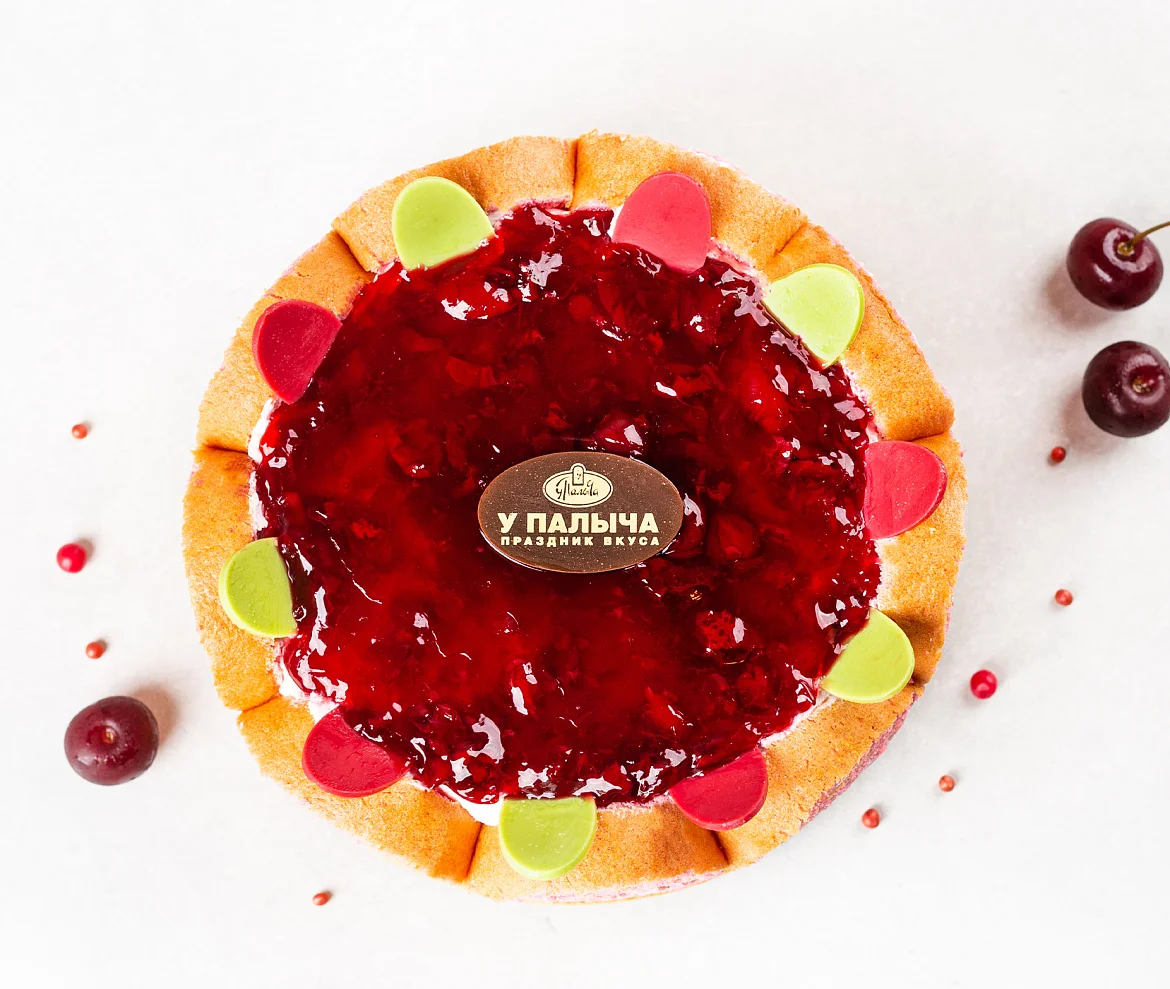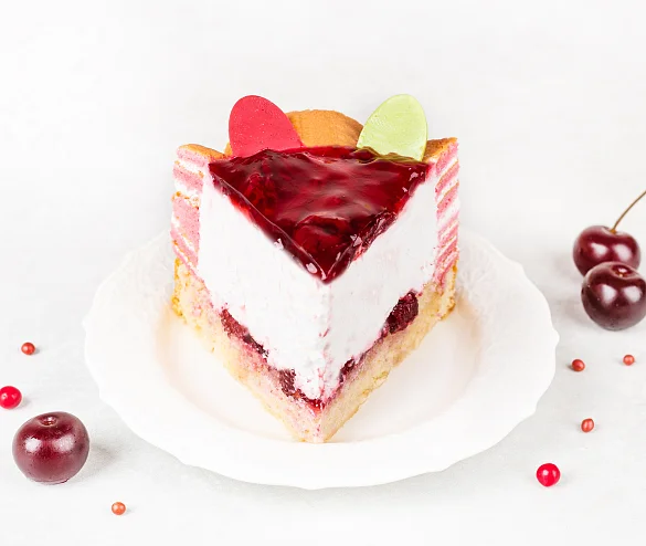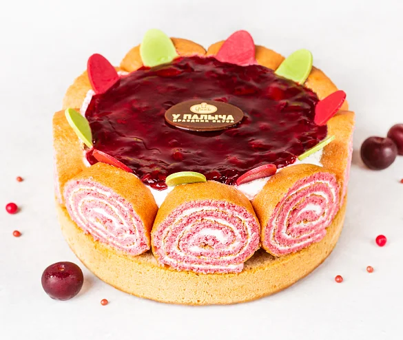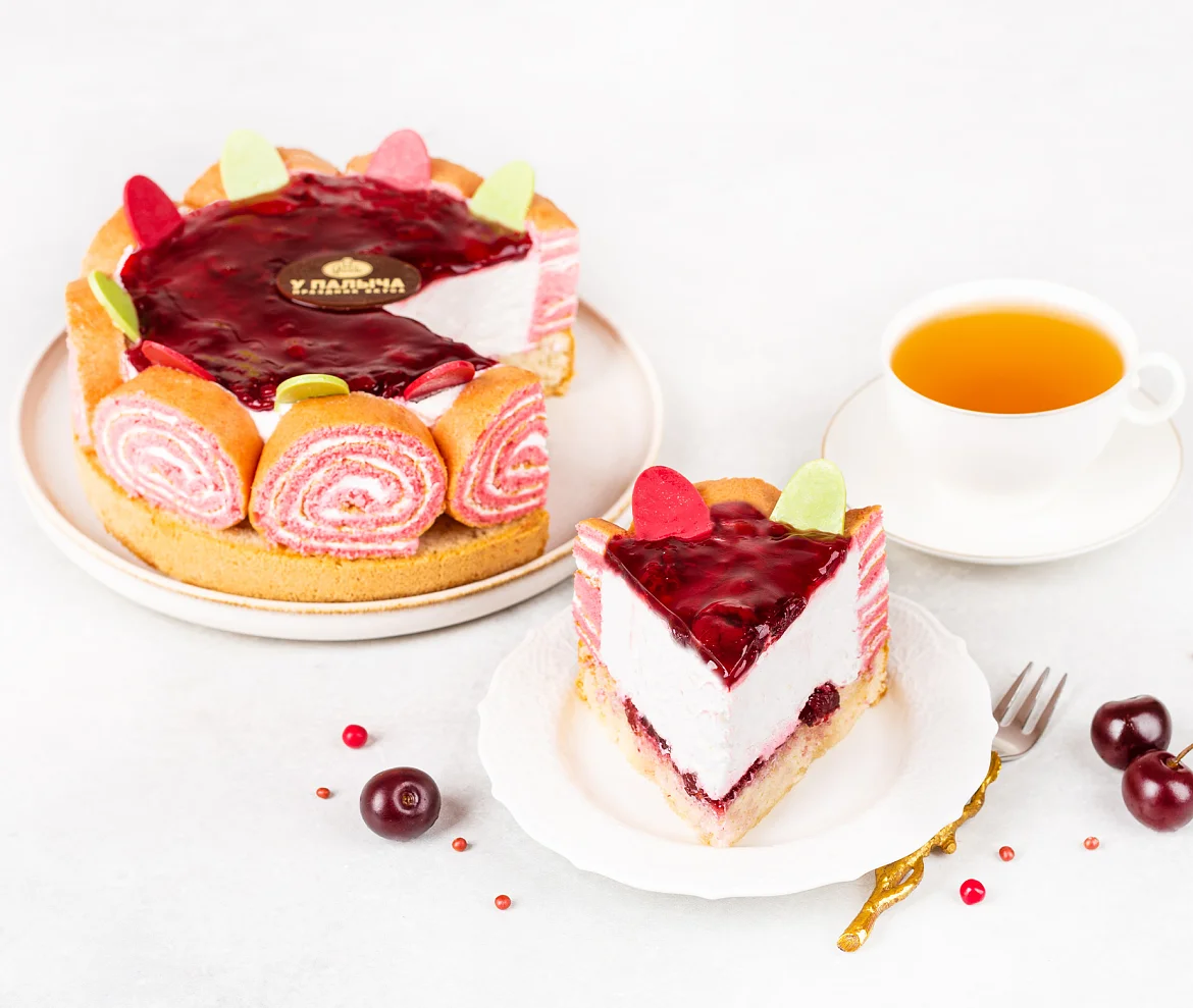 Основа торта - классический бисквит, промазан вишневой начинкой, боковые стороны оформлены бисквитными рулетами с клубничным вареньем, пропитан сахарным сиропом с ликером. Бисквитная корзина наполнена воздушным кремом из взбитых сливок с ароматной вишней. Торт украшен отборной вишней, ягодами и лепестками из фруктового мармелада собственного производства.