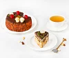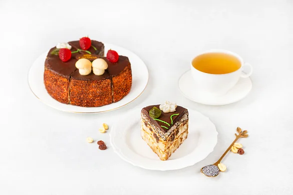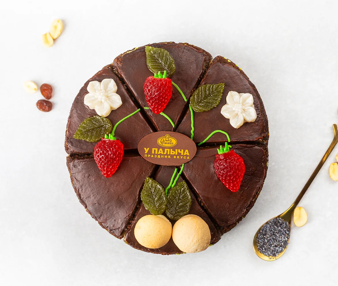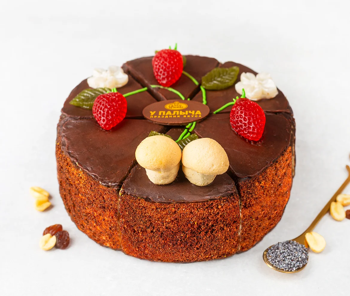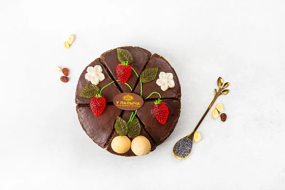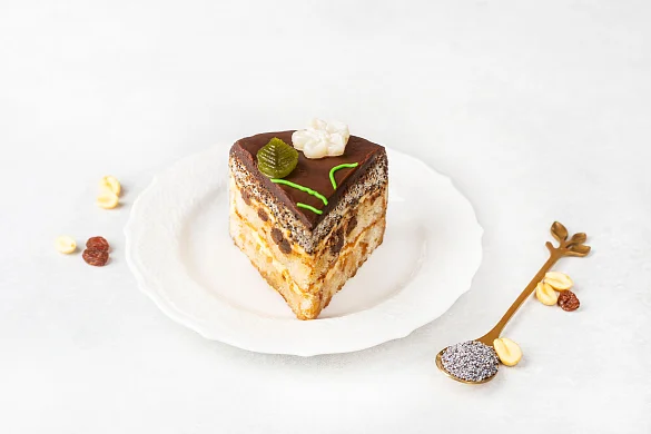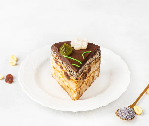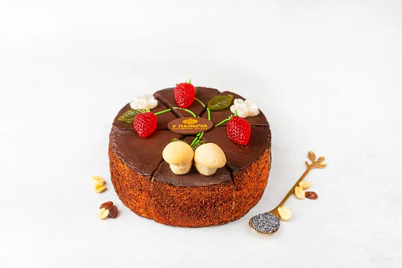 Изумительный торт из трех видов белого бисквита – с маком, с арахисом и изюмом. Бисквит пропитан сахарным сиропом с добавлением ликера, каждый слой промазан сливочным кремом. Торт порционный, боковые стороны украшены шоколадной крошкой, поверхность залита шоколадной помадкой и украшена ягодками из фруктового мармелада и листиками из темного шоколада.
