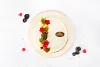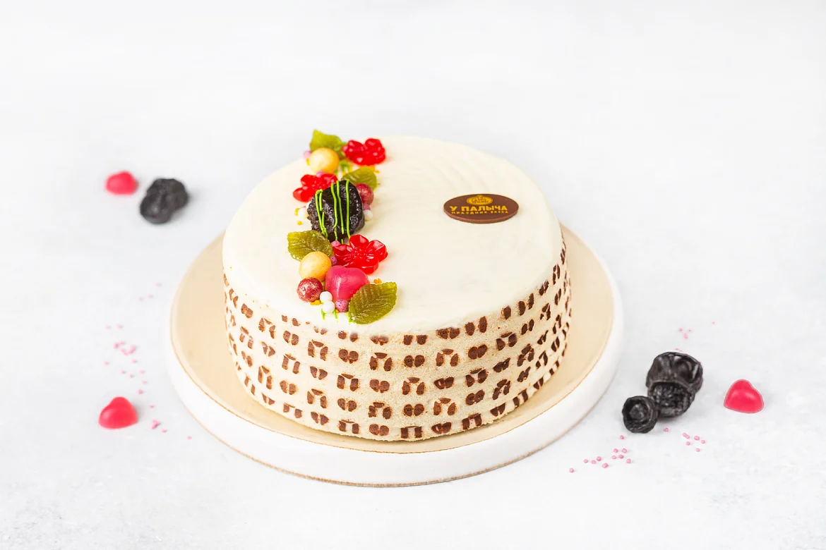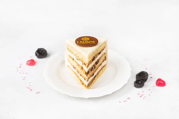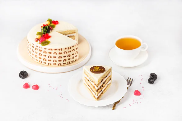 Сочетание трех мягких песочных коржей на сметане, сливочного суфле с натуральным сгущенным молоком без заменителей молочных жиров и сливочно-заварного крема с нежным разваренным черносливом и спелой сливой. Торт украшен изящной композицией с темным шоколадом, фруктовым мармеладом, рисовыми бусинами в белом шоколаде и настоящим черносливом. Боковые стороны оформлены нежным рулетным бисквитом с узнаваемым рисунком.