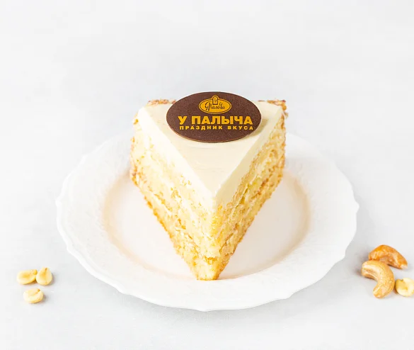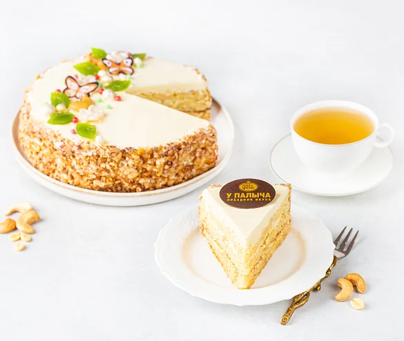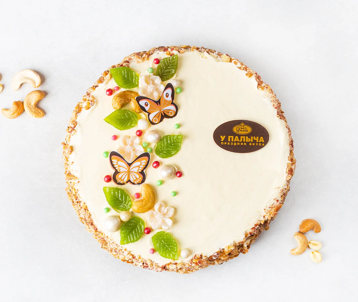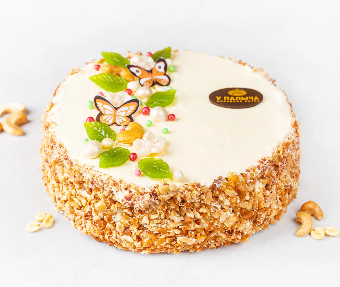 Вкус знакомый с детства. Классический бисквит с арахисом, прослоенный сливочным кремом с дробленым арахисом, пропитанного сахарным сиропом с добавлением коньяка. Торт украшен цветами, листиками из фруктового мармелада и бабочками из настоящего темного шоколада. Боковые стороны украшены дробленым арахисом.