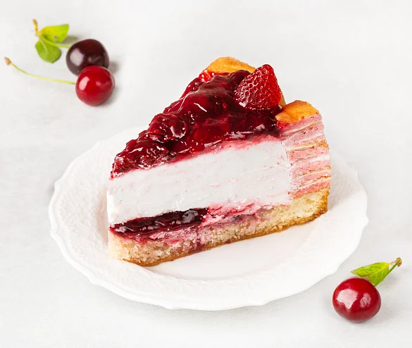 Основа торта - классический бисквит, промазан вишневой начинкой, боковые стороны оформлены бисквитными рулетами с клубничным вареньем, пропитан сахарным сиропом с ликером. Бисквитная корзина наполнена воздушным кремом из взбитых сливок с ароматной вишней. торт украшен отборной вишней, ягодами и лепестками из фруктового мармелада собственного производства.Торт украшен отборной вишней, ягодами и лепестками из фруктового мармелада собственного производства.