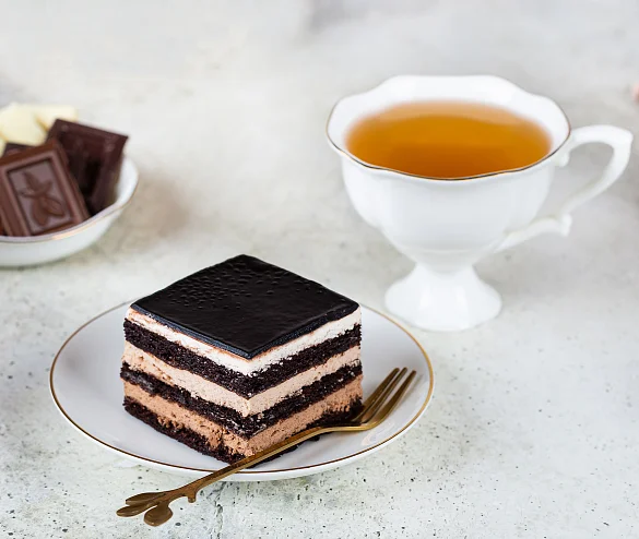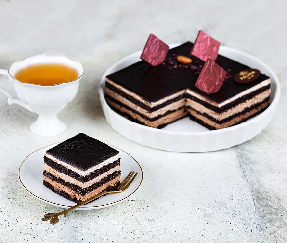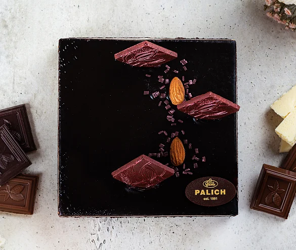 Уникальный торт без пшеничной муки. Превосходное сочетание трёх видов мусса из белого, молочного и тёмного шоколада с нежным шоколадным бисквитом на основе какао.