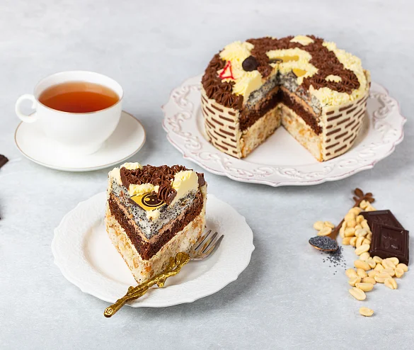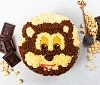 Торт состоит из трех видов бисквита – белого с дробленым арахисом, шоколадного, белого с маком, пропитанных сахарным сиропом, прослоенного двумя видами крема – сливочным и сливочно-шоколадным. Изящное украшение торта в виде зверюшек из сливочного и сливочно-шоколадного крема.