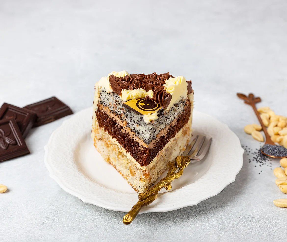 Сахар, яйцо куриное пищевое, молоко цельное сгущенное с сахаром (10%) (молоко нормализованное, сахар (сахароза, лактоза)), масло сливочное (10%) (сливки пастеризованные), мука пшеничная в/с, вода очищенная, сметана (сливки, закваска), ядра арахиса, молоко питьевое, мак пищевой, шоколад темный (какао тёртое, сахар, масло какао, эмульгатор соевый лецитин, ароматизатор экстракт ванили натуральный), какао-порошок, крахмал картофельный, патока, разрыхлитель сода пищевая (гидрокарбонат натрия), уксус столовый, глюкоза ферментированная, ароматизатор экстракт ванили натуральный, крахмал кукурузный, красители: бета-каротин, кармины, экстракт лютеина, оксиды железа; масло какао.