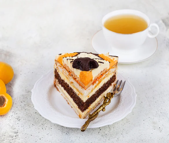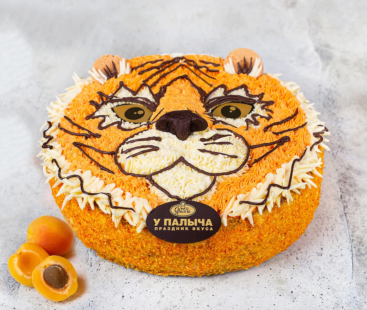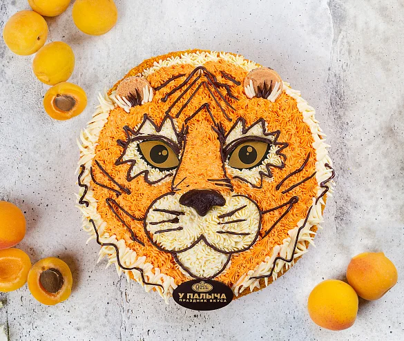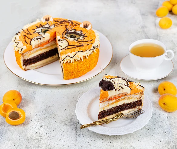 Этот вкусный и красивый торт состоит из двух слоев воздушного белого и шоколадного бисквитов, пропитанных сладким сиропом, нежного абрикосового джема и сливочного крема. Торт в виде величественного и прекрасного тигра принесет удачу и порадует вкусом.