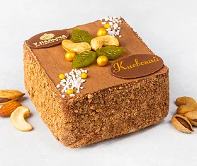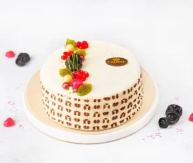 Воздушный бисквит яркого красного цвета в сочетании с белоснежным кремом из настоящего творожно-сливочного сыра собственного изготовления. Карамельно-шоколадный грильяж с отборным фундуком, уникальным карамельным шоколадом и клубничным ароматом для изысканности вкуса и яркости ощущений. Торт нарезан на 16 кусочков. В декоре фирменные медальки из настоящего темного шоколада и сердечки из карамельного шоколада - уникальной разработки шоколатье У Палыча с манящим вкусом карамели волшебного карамельного цвета.