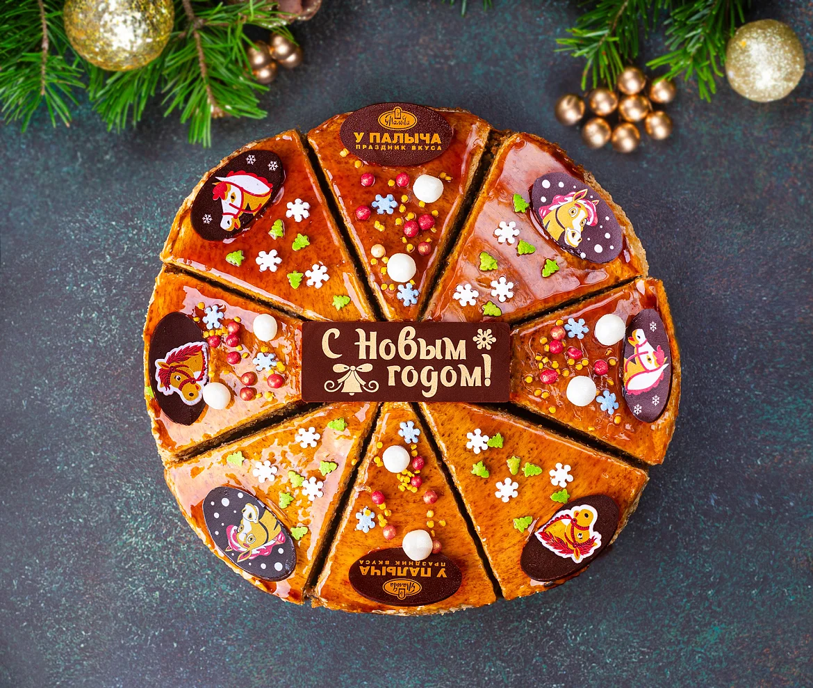 Поздравительная надпись на торте может отличаться, но обязательно будет праздничной. Грецкие орехи в сливочной карамели, легкий сливочно - заварной крем с добавлением вареного сгущенного молока, коржи с натуральным цветочным медом - сбалансированное сочетание для гармоничного вкуса. Изысканное лакомство украшено медальками из темного шоколада с новогодними рисунками, а также сладким разноцветным конфетти и поздравительной шоколадной табличкой из лучших какао-продуктов.