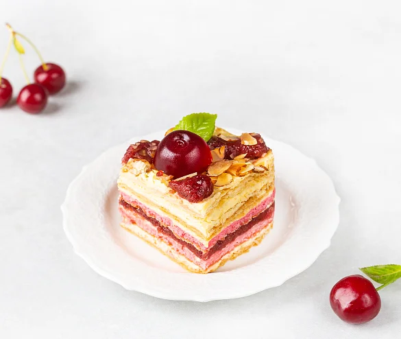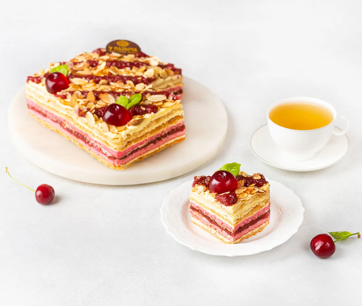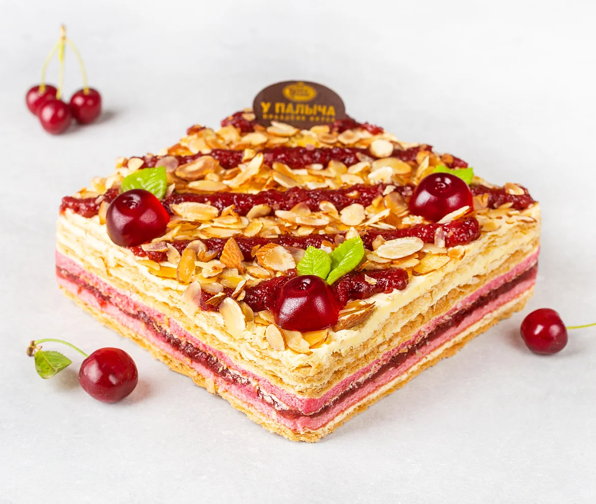 Легендарный торт с новым вкусом! Восхитительный заварной крем с воздушной итальянской меренгой, натуральным молоком и отборным сливочным маслом. 3 нежных пропитанных кремом слоеных коржа и 2 тонких воздушных бисквита. Изобилие ароматной начинки из сладкой сербской вишни. Торт - визитная карточка У Палыча - сочетание нежности и яркого экзотического вкуса!