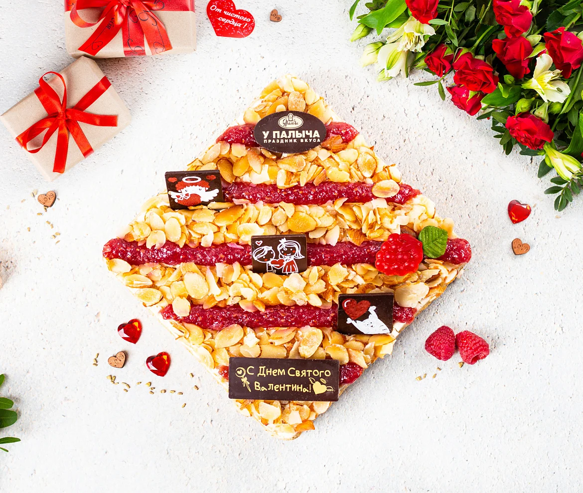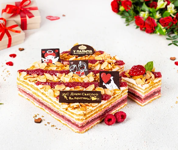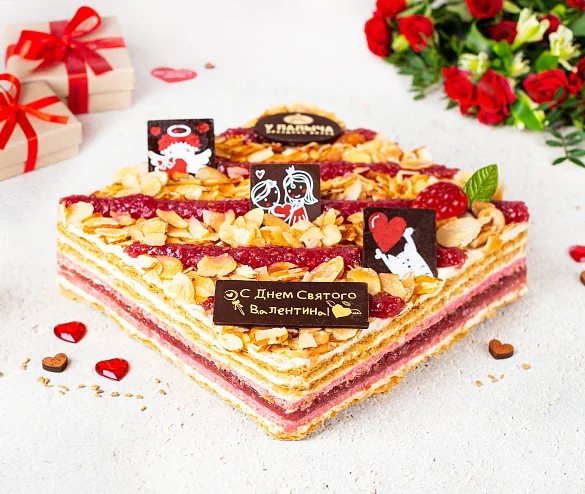 Тончайшие слоеные коржи и нежный бисквит, сливочно заварной крем с итальянской меренгой, с вкуснейшей начинкой собственного производства из душистой лесной малины. Торт украшен милыми шоколадными открытками из лучшего темного шоколада специально к Дню святого Валентина. ***Поздравительная надпись на торте может отличаться, но обязательно будет праздничной.