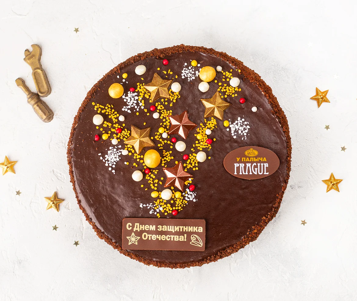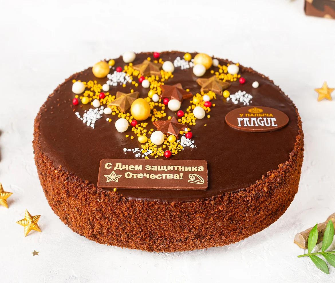 Необыкновенный торт, выпеченный со сметаной и натуральным сгущенным молоком, отборным сливочным маслом и натуральным шоколадом. Три слоя шоколадного бисквита, взбитый нежный сливочно-шоколадный крем и темный шоколад - истинное шоколадное наслаждение! Прага от Палыча нежная и ароматная, благодаря ликёру в пропитке коржей, раскрывающему густой шоколадный вкус эквадорского какао. К Дню Защитника Отечества торт украшен праздничным декором в виде салюта из звездочек, воздушного риса и поздравительной табличкой из настоящего темного шоколада. ***Поздравительная надпись на торте может отличаться, но обязательно будет праздничной.