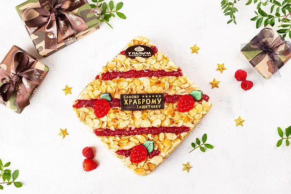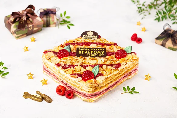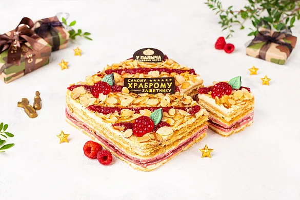 Тончайшие слоеные коржи и нежный бисквит, сливочно-заварной крем с итальянской меренгой, с вкуснейшей начинкой собственного производства из душистой лесной малины. Торт украшен миндальными лепестками, малиновым джемом и малинками из фруктового мармелада, а специально к празднику День Защитника Отечества на торте шоколадная табличка с праздничной надписью из лучшего темного шоколада. ***Поздравительная надпись на торте может отличаться, но обязательно будет праздничной.