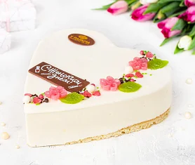 Воздушный бисквит яркого красного цвета в сочетании с белоснежным кремом из настоящего творожно-сливочного сыра собственного изготовления. Карамельно-шоколадный грильяж с уникальным карамельным шоколадом и клубникой для изысканности вкуса и яркости ощущений. К празднику 8 Марта торт выполнен в форме сердца и украшен яркими весенними цветами и праздничной шоколадной фигурной табличкой. ***Поздравительная надпись на торте может отличаться, но обязательно будет праздничной.