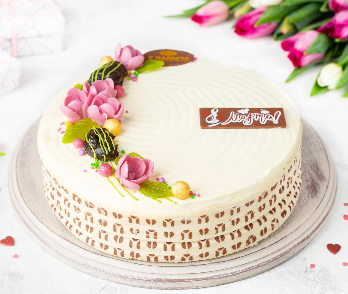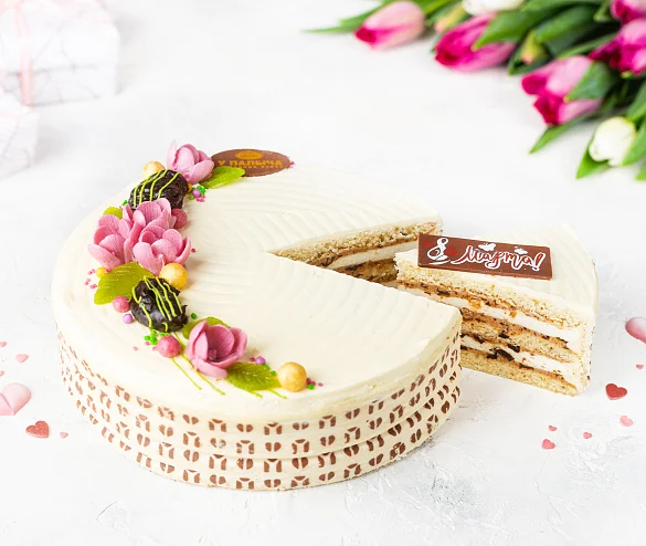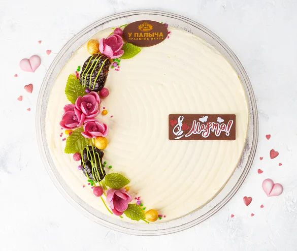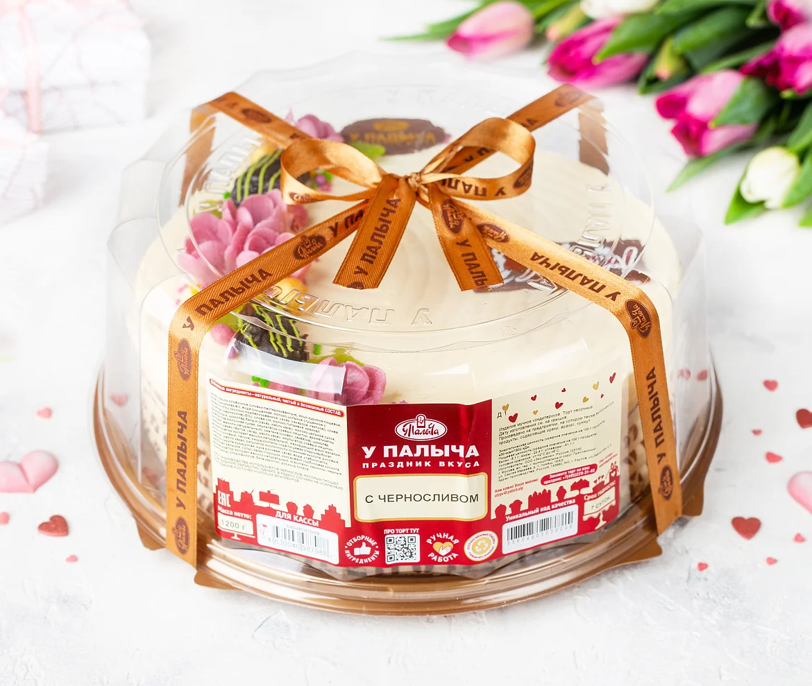 Этот торт, визитная карточка бренда У ПАЛЫЧА, состоит из рассыпчатых песочных коржей на натуральном сливочном деревенском масле и сгущенном молоке, нежного воздушного суфле с отборным ароматным черносливом с вкуснейшим сливочно-фруктовым кремом. Специально к Женскому дню торт украшен яркой праздничной композицией с вкуснейшим черносливом, шоколадными фигурками, рисовыми шариками и поздравительной табличкой из элитного темного шоколада из отборных какао-продуктов. ***Поздравительная надпись на торте может отличаться, но обязательно будет праздничной.