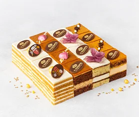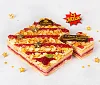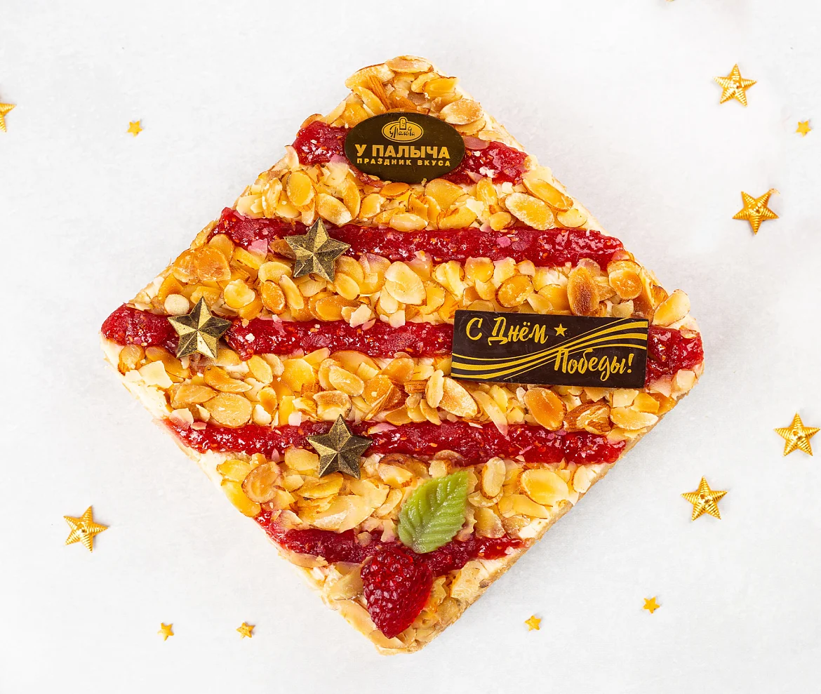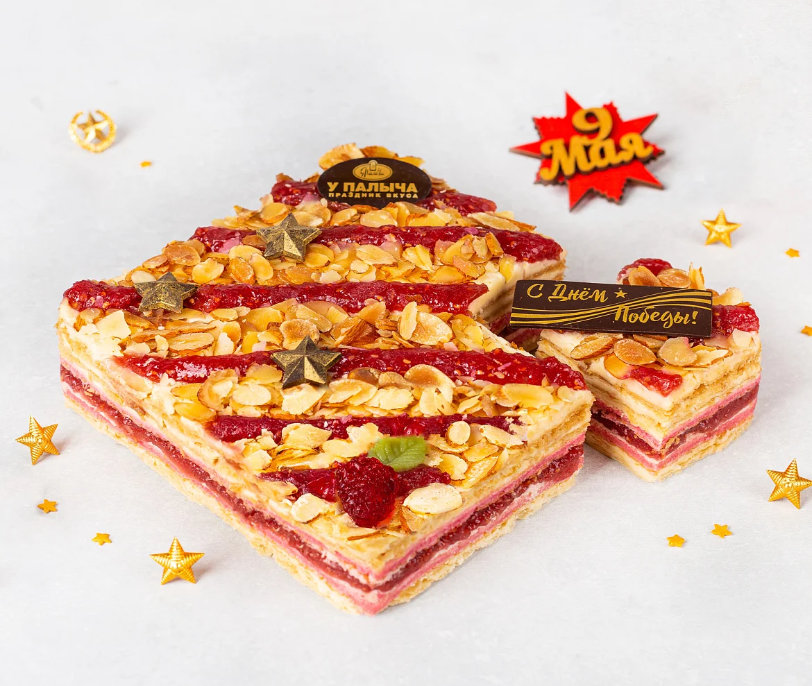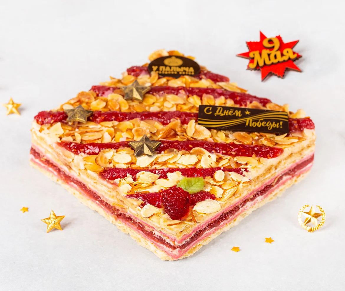 Тончайшие слоеные коржи и нежный бисквит, сливочно-заварной крем с итальянской меренгой, с вкуснейшей начинкой собственного производства из душистой лесной малины. Специально к празднику 9 Мая торт украшен яркими звездами и поздравительной табличкой из премиального темного шоколада без заменителей какао-продуктов. ***Поздравительная надпись на торте может отличаться, но обязательно будет праздничной.