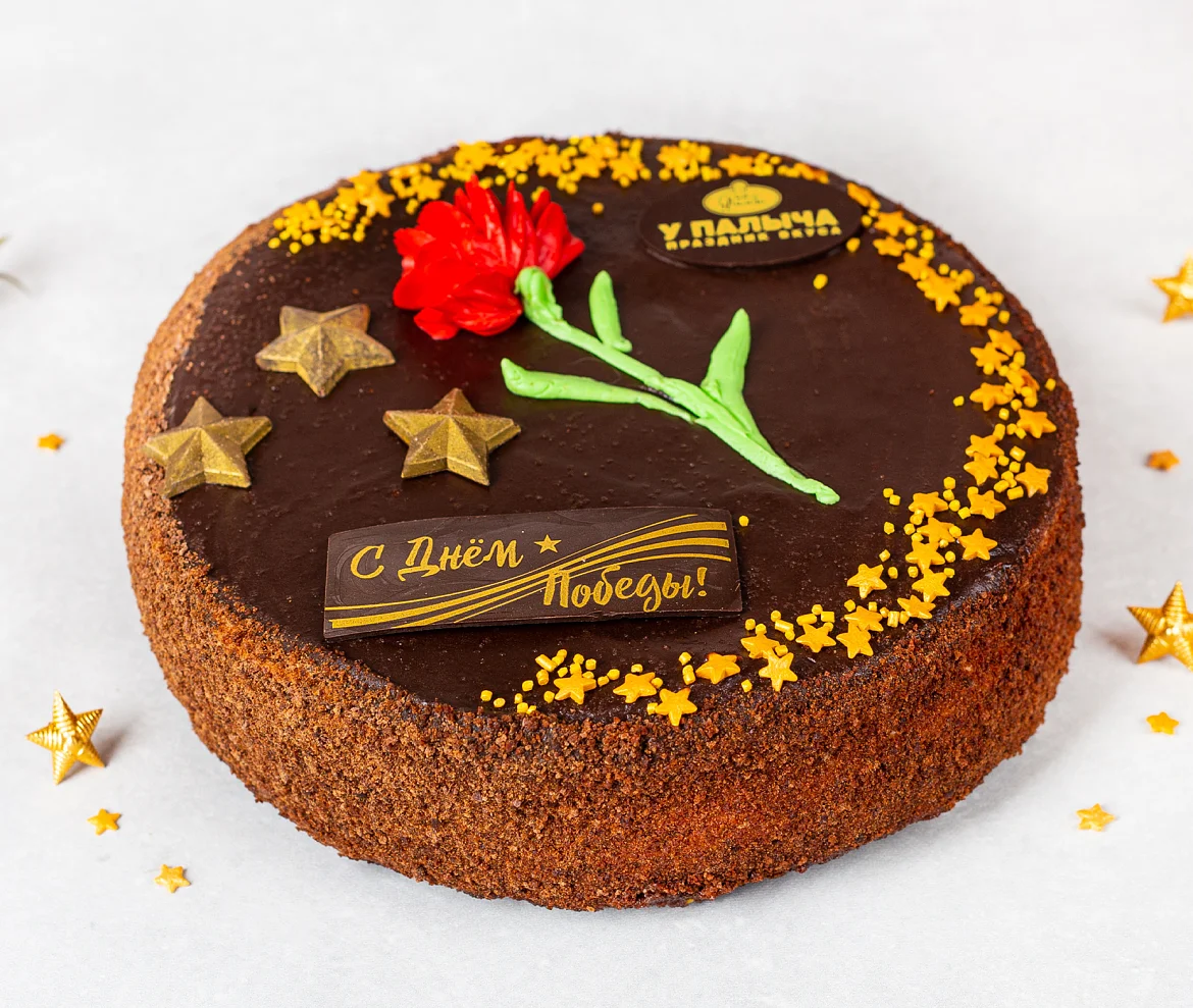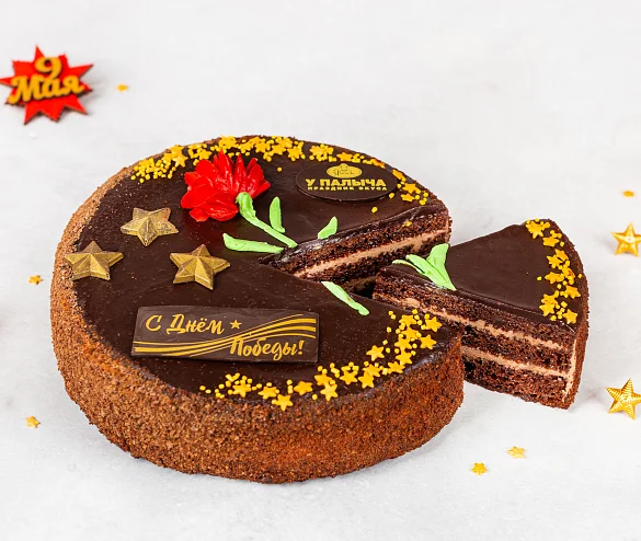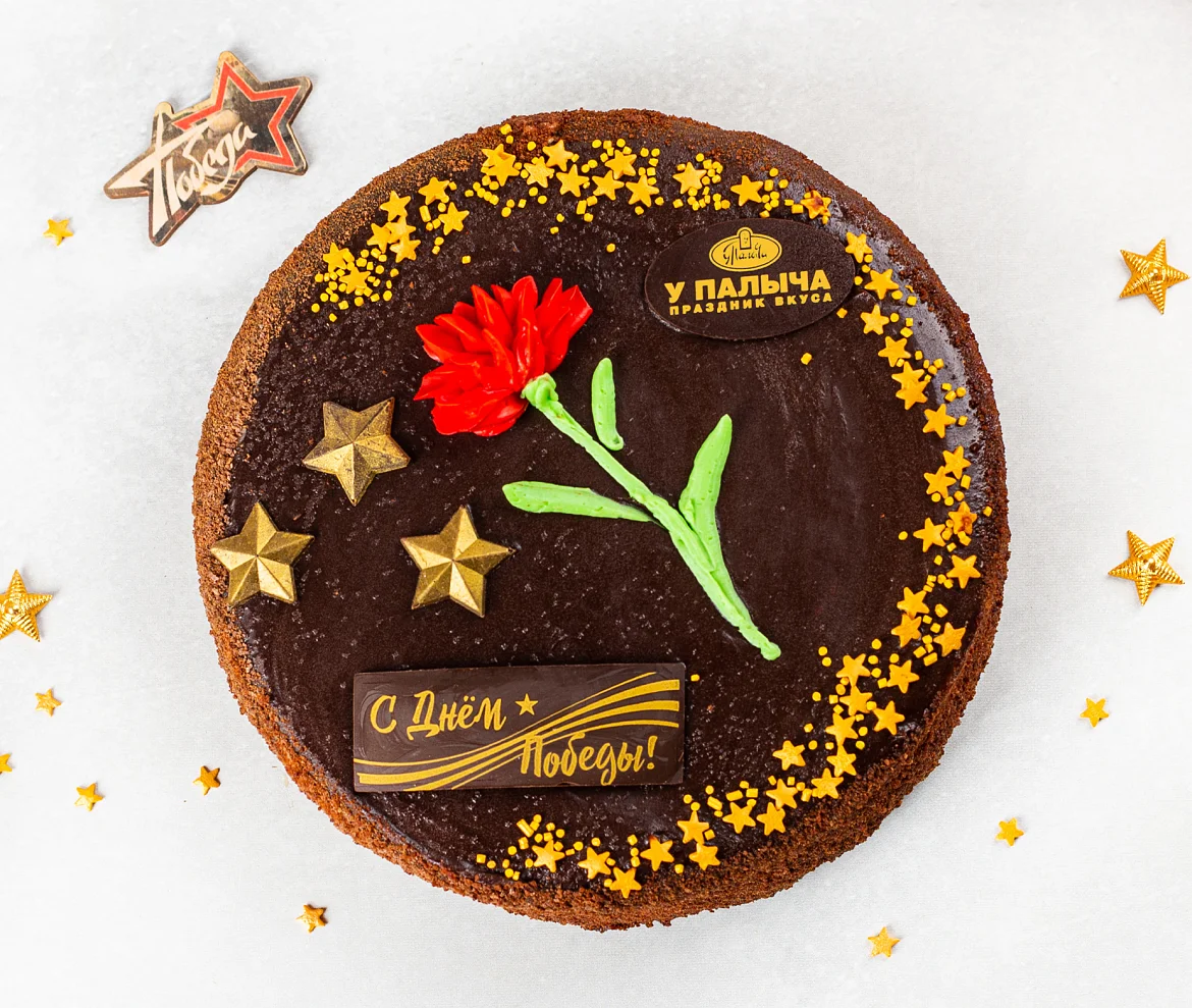 Необыкновенный торт, выпеченный со сметаной и натуральным сгущенным молоком, отборным сливочным маслом и натуральным шоколадом. Три слоя шоколадного бисквита, взбитый нежный сливочно-шоколадный крем и темный шоколад - истинное шоколадное наслаждение! Прага от Палыча нежная и ароматная, благодаря ликеру в пропитке коржей, раскрывающему густой шоколадный вкус эквадорского какао. Ко Дню Победы торт украшен праздничной гвоздикой из сливочного крема и поздравительной табличкой из премиального темного шоколада. ***Поздравительная надпись на торте может отличаться, но обязательно будет праздничной.