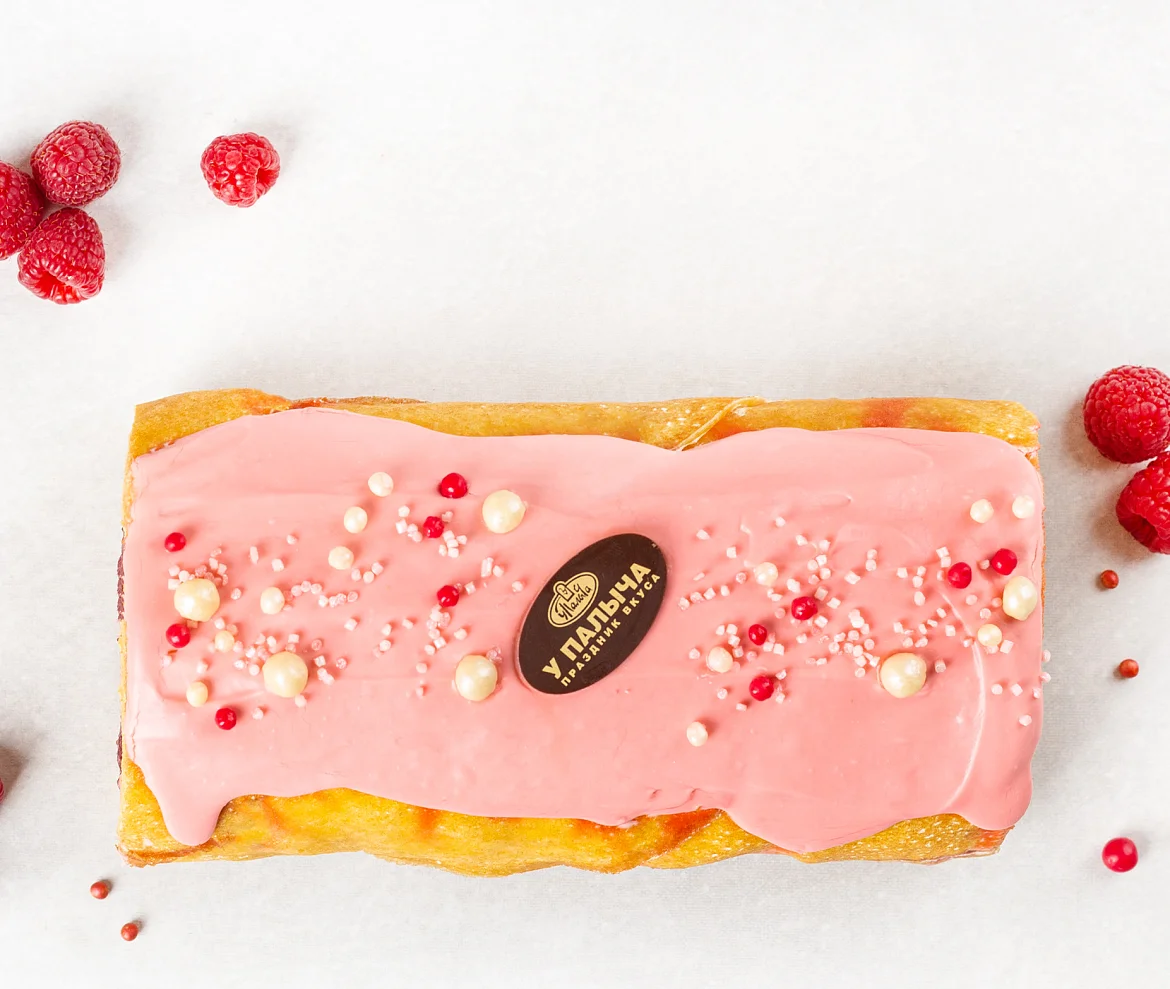 Нежные бездрожжевые блинчики с натуральным цельным молоком и свежими яйцами в основе этого оригинального торта-рулета. Воздушный крем с натуральным творожным сыром и много начинки из ароматной лесной малины. Сверху на торте вкуснейший ганаш из нежного белого шоколада от шоколаье У Палыча и яркие рисовые бусинки в шоколаде. Великолепный вкус и легендарное качество от Палыча.