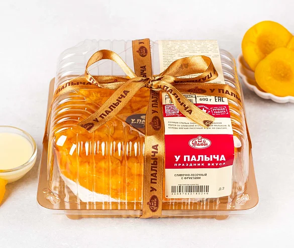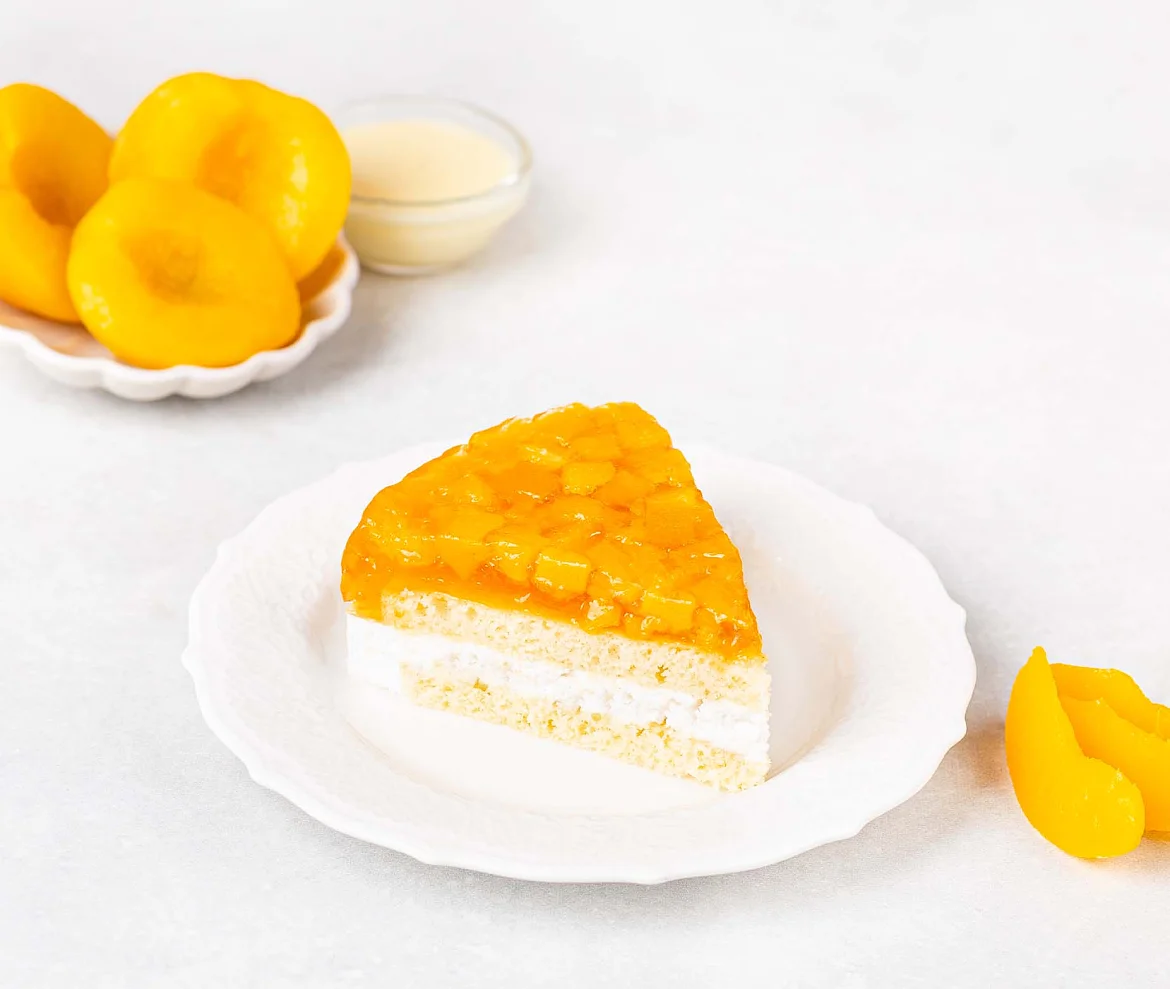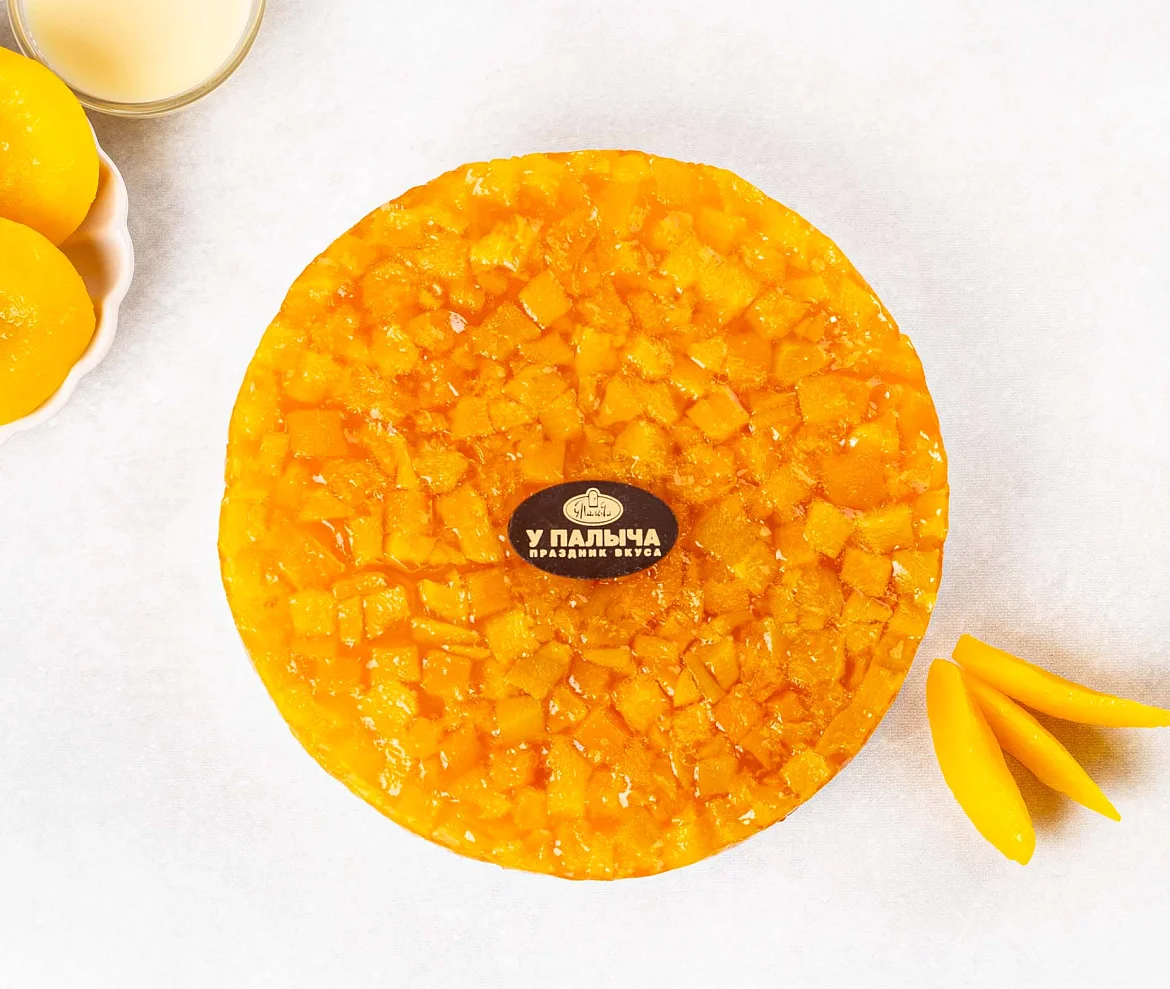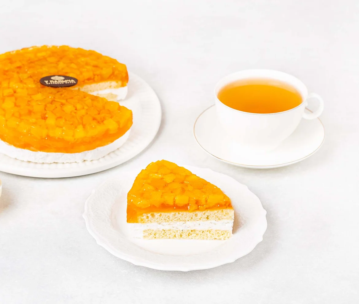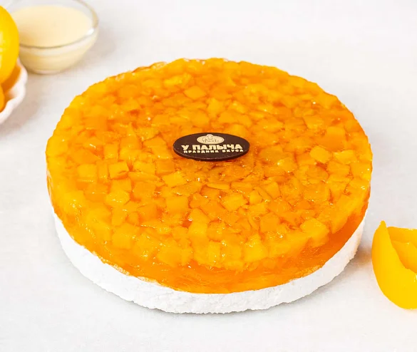 Легкий воздушный торт с сочными спелыми персиками. В основе мягкий песочный корж на фермерской сметане, в центре слой нежного молочного мусса с натуральными сливками и сгущенным молоком. По традиции на торте фирменная медалька из премиального темного шоколада из отборных какао-продуктов.