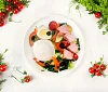 Листья салата Айсберг свежие, картофель свежий, томаты свежие, яйцо куриное пищевое, тунец (Полосатик) консервированный рубленый (тунец, вода, соль), фасоль стручковая с/м, масло подсолнечное рафинированное дезодорированное, огурцы свежие, перец сладкий свежий, соус Уочестер (уксус солодовый (из ячменя), уксус, патока, сахар, соль, анчоусы, экстракт тамаринда, лук, чеснок, специи, ароматизаторы), вода очищенная, маслины черные б/к (маслины, вода питьевая, соль, фиксатор окраски глюконат железа), уксус столовый, сахар, соль, сухой яичный желток, сухое обезжиренное молоко, нерафинированное горчичное масло. Произведено на предприятии, на котором также выпускаются продукты, содержащие арахис, кунжут, моллюски, орехи, сельдерей, сою.