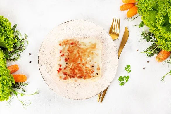 Насладитесь изысканным вкусом нашего белкового омлета с курицей — настоящего оазиса лёгкости и насыщенности! Воздушная белковая масса, нежно взбитая с молоком и приправленная солью и молотым белым перцем, обнимает тонкие кольца рулета из курицы для холодца, добавляя блюду сочность и деликатный аромат. Запечённый красный болгарский перец кубиками придаёт яркость и сладковатую нотку, а золотистая сырная корочка сверху завершает этот гастрономический шедевр. Идеально для ценителей утончённых и полезных вкусов!