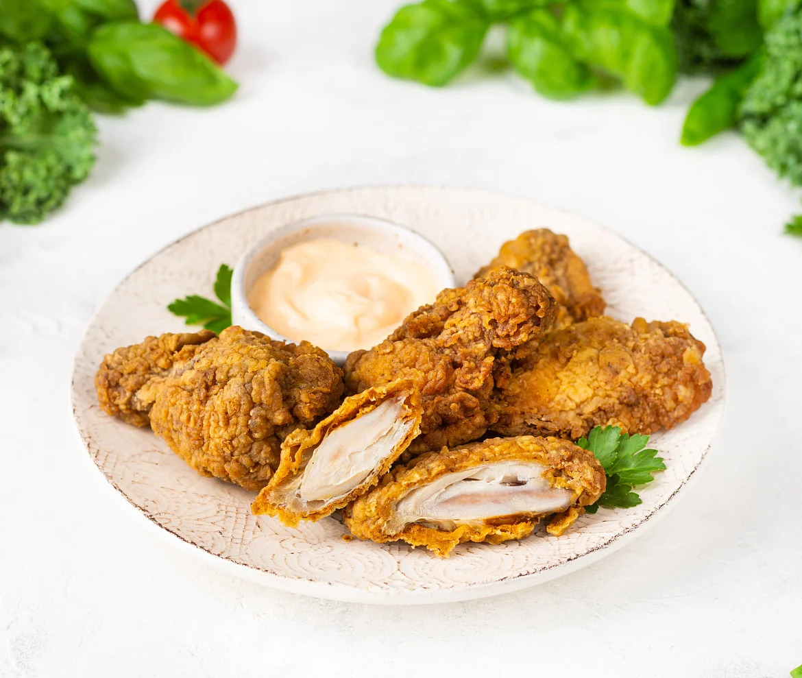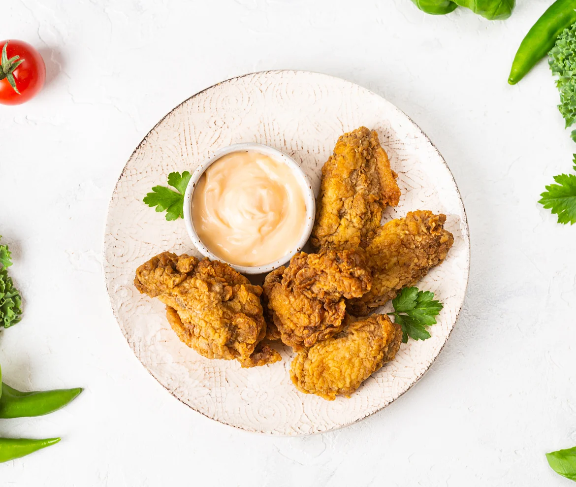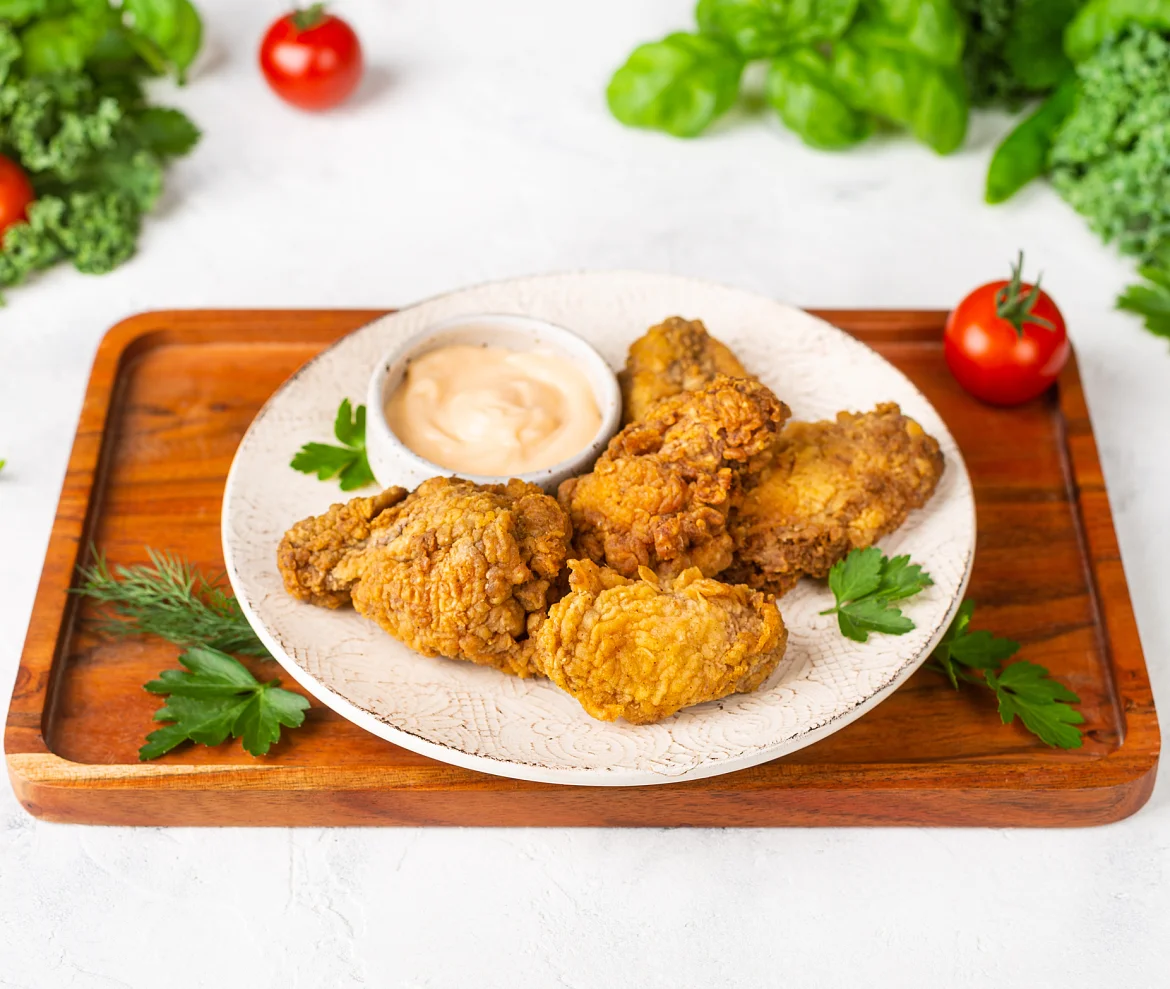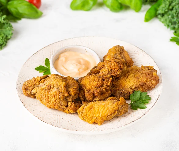 Нежное мясо цыпленка, обжаренное до золотистой корочки, раскрывает насыщенный букет специй: сладкая паприка, душистый кориандр, пикантный чеснок, острый перец чили и черный перец создают гармоничное сочетание, которое пробуждает аппетит. Дополняет блюдо нежный сырный соус с бархатистой текстурой и насыщенным вкусом. Насладитесь аппетитным сочетанием хрустящих крылышек и кремового соуса — это блюдо создано для уютных вечеров и дружеских посиделок!