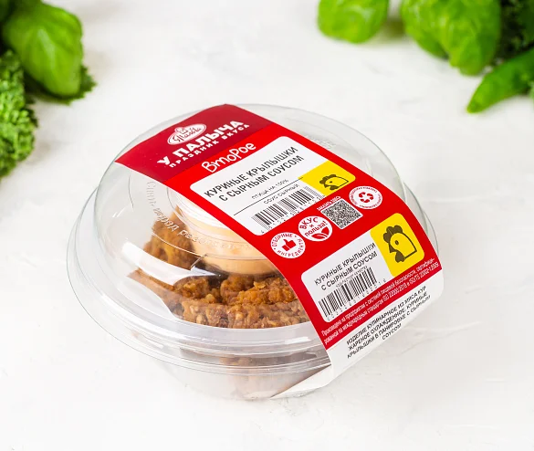 Куриные крылышки. Крыло цыпленка-бройлера, масло подсолнечное рафинированное дезодорированное, мука пшеничная в/с, паприка сладкая молотая, соль, чеснок сушеный гранулированный, перец черный молотый, кориандр молотый, перец чили. Соус. Вода очищенная, масло подсолнечное рафинированное дезодорированное, крахмал кукурузный, уксус столовый, сахар, сырный порошок (сыр полутвердый, сыворотка подсырная сухая), соль, загуститель ксантановая камедь, краситель экстракт паприки, консервант сорбат калия, ароматизатор. Произведено на предприятии, на котором также выпускаются продукты, содержащие арахис, горчицу, кунжут, моллюски, орехи, рыбу, сельдерей, сою.