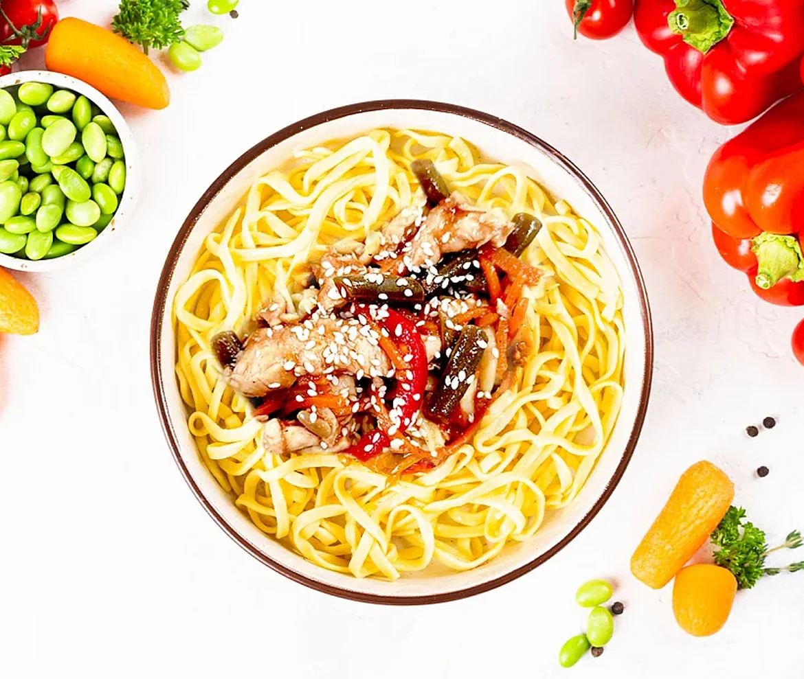 Наш аппетитный вок с курицей и овощами раскрывает нежный вкус сочного куриного мяса, гармонирующий с хрустящей морковью и сладким болгарским перцем. Зеленая фасоль и лапша удон добавляют сытности, а уникальная смесь соусов, меда и кунжутного масла с ароматными специями придаёт сладковато-пикантный шлейф. Блюдо сохраняет свежесть и сочность, идеально подходя для ценителей насыщенного вкуса! Энергетическая ценность (калорийность): 700 кДж (167 ккал).
