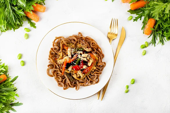 Азиатский мотив с фирменным стилем. Диетическое мясо куриной грудки припущенное со свежими овощами, специями и приправами с добавлением соевого соуса. В дополнение тонкая гречневая лапша с ярким вкусом. Энергетическая ценность (калорийность): 868 кДж (207 ккал).