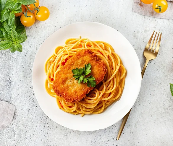 Нежный медальон из сочного куриного филе в хрустящей панировке из золотистых сухарей, дополненный ароматными макаронами из твёрдых сортов пшеницы. Лёгкая пряность чёрного перца и натуральные ингредиенты создают идеальный баланс вкуса. Сытное и аппетитное блюдо, которое подарит удовольствие и уют в каждом кусочке! Энергетическая ценность (калорийность): 949 кДж (226 ккал).