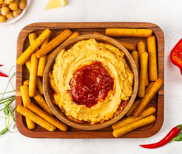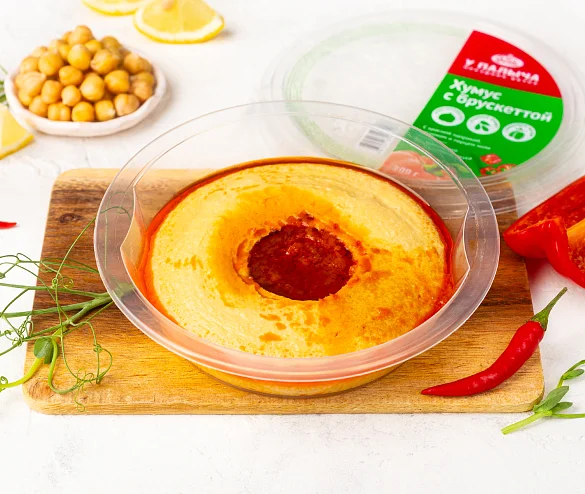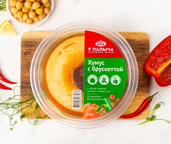 Хумус с брускеттой от Палыча — изысканное сочетание ближневосточной классики и средиземноморского колорита. В основе — особо крупный нут, настоящее оливковое масло и ароматная тахина из отборного кунжута собственного изготовления. А сверху — наша фирменная брускетта: сочная смесь сладкого перца, паприки и щепотки чили. Она придаёт блюду яркий вкус, лёгкую пикантность и выразительный характер. Готовая закуска, в которой каждая ложка — это вкусовое путешествие.