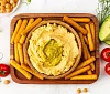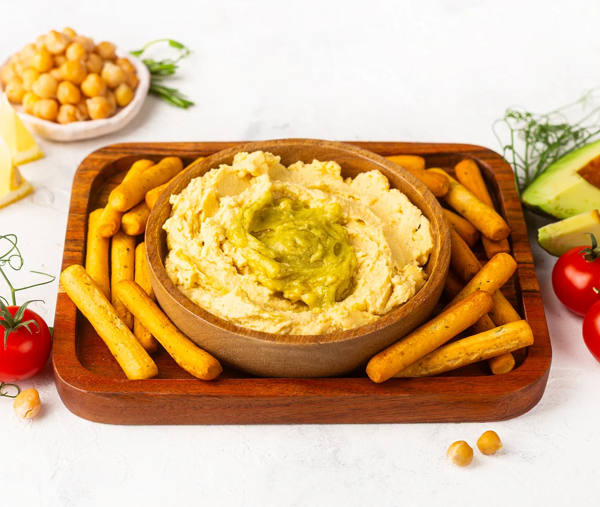 Хумус с гуакамоле от Палыча — это смелый дуэт восточной классики и латиноамериканской свежести. В основе — традиционный хумус из особо крупного нута, с добавлением настоящего оливкового масла и ароматной тахины из отборного кунжута собственного изготовления. А сверху — яркое пюре гуакамоле с авокадо, болгарским перцем и кориандром. Это сочетание придаёт блюду нежную кремовую текстуру, свежий вкус и пикантные цитрусово-пряные акценты. Современно, необычно, и при этом — абсолютно натурально.