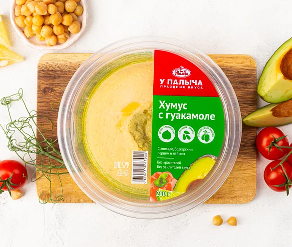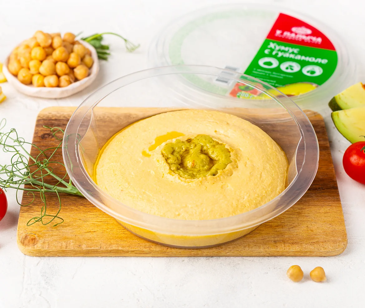 Вода очищенная, нут, масло оливковое (нерафинированное и рафинированное), масло рапсовое рафинированное дезодорированное, семена кунжута, пюре гуакамоле (авокадо, красный болгарский перец, листья кориандра, регулятор кислотности лимонная кислота, перец черный молотый), паприка красная сушеная, перец красный чили молотый, соль, лук сушеный жареный, уксус столовый, чеснок сушеный, масло подсолнечное рафинированное дезодорированное, консервант сорбат калия. Произведено на предприятии, на котором также выпускаются продукты, содержащие арахис, молоко, орехи, сою, яйца.