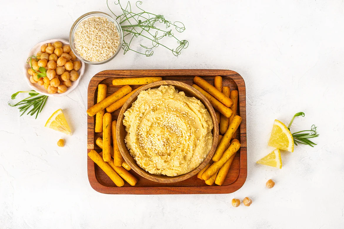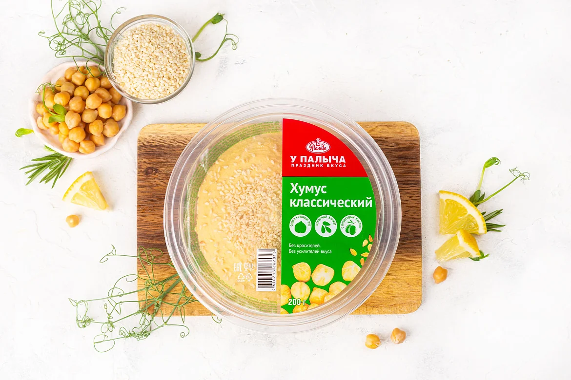 Хумус от Палыча — это классическая ближневосточная закуска в авторском исполнении. Мы используем отборный, особо крупный нут, чтобы добиться по-настоящему нежной и в то же время насыщенной текстуры. В составе настоящее оливковое масло, которое придаёт блюду благородный вкус и тонкий аромат. А тахину мы готовим сами — из тщательно обжаренных семян отборного кунжута, чтобы сохранить естественную ореховую нотку. Никаких лишних добавок — только то, что нужно для идеального хумуса.