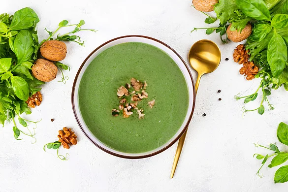 Нежный крем-суп, в котором главный акцент — на свежем вкусе и пользе шпината. Зелёные листья придают блюду насыщенный цвет, природную свежесть и заряд витаминов. Мягкое кокосовое молоко обогащает вкус лёгкими тропическими нотами и делает текстуру бархатной. Аромат чеснока, петрушки и щепотка чёрного перца раскрывают глубину вкуса, а грецкий орех добавляет деликатный ореховый штрих и питательность. Картофель придаёт супу нежную плотность и мягкость. Полезное и гармоничное блюдо для тех, кто ценит вкус и заботу о себе. Энергетическая ценность /калорийность: 360 кДж/ 86 ккал.