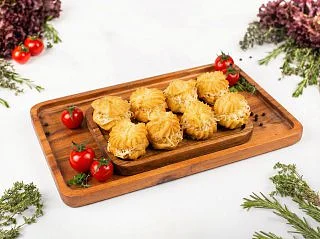 Изысканная французская закуска из легкого заварного теста в сочетании с нежной начинкой из плавленого и Российского сыра, свежих куриных яиц с добавлением чеснока и майонеза.