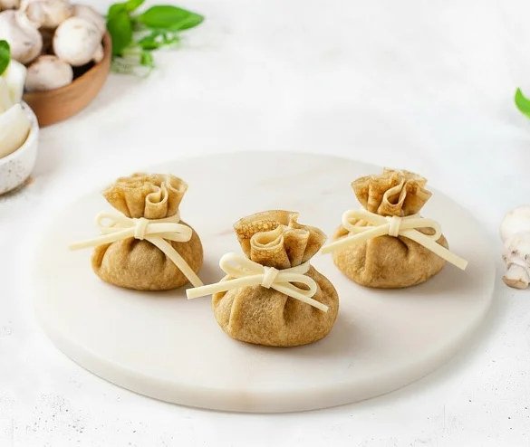 Аппетитная оригинальная закуска для сытного перекуса. Нежные, тающие во рту блинчики, собранные в изящные мешочки, скрывают внутри ароматную, сочную начинку из обжаренных грибов с луком в соусе Бешамель.