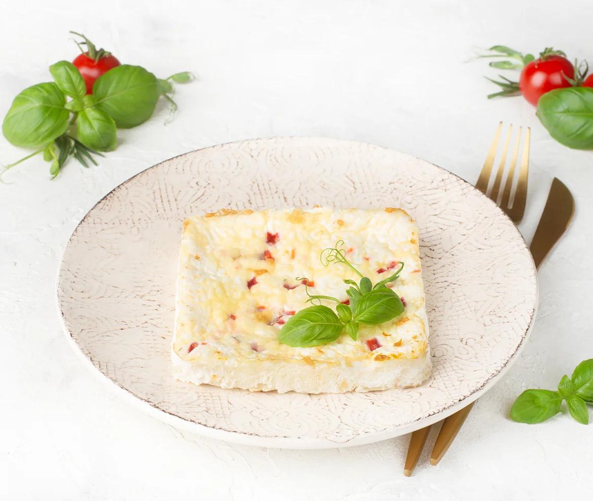 Воздушная белковая масса, нежно взбитая с молоком и приправленная солью и молотым белым перцем, обнимает тонкие кольца рулета из курицы для холодца, добавляя блюду сочность и деликатный аромат. Запечённый красный болгарский перец кубиками придаёт яркость и сладковатую нотку, а золотистая сырная корочка сверху завершает этот гастрономический шедевр. Энергетическая ценность (средние значения на 100 г продукта): 99 ккал/415 кДж.