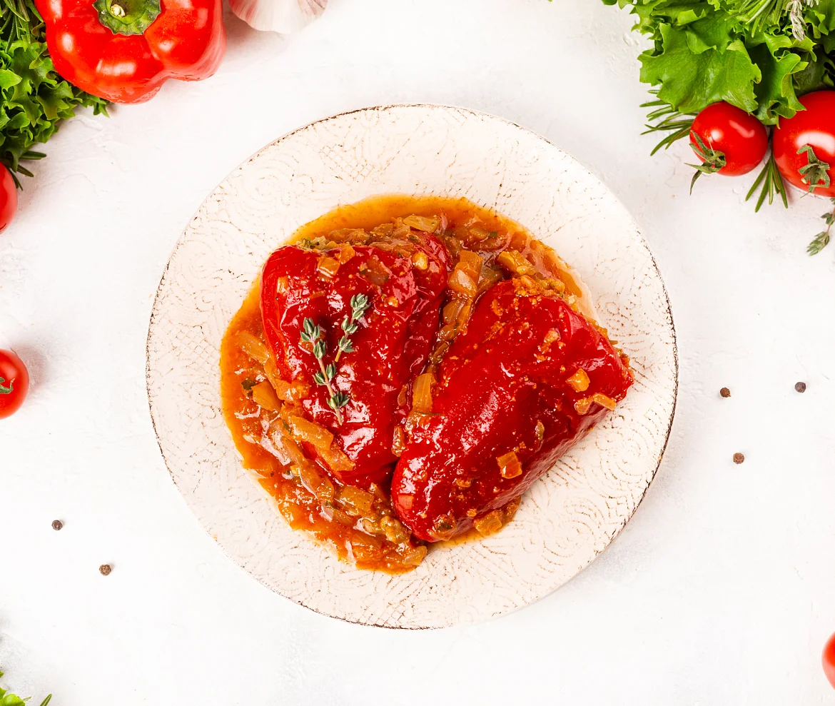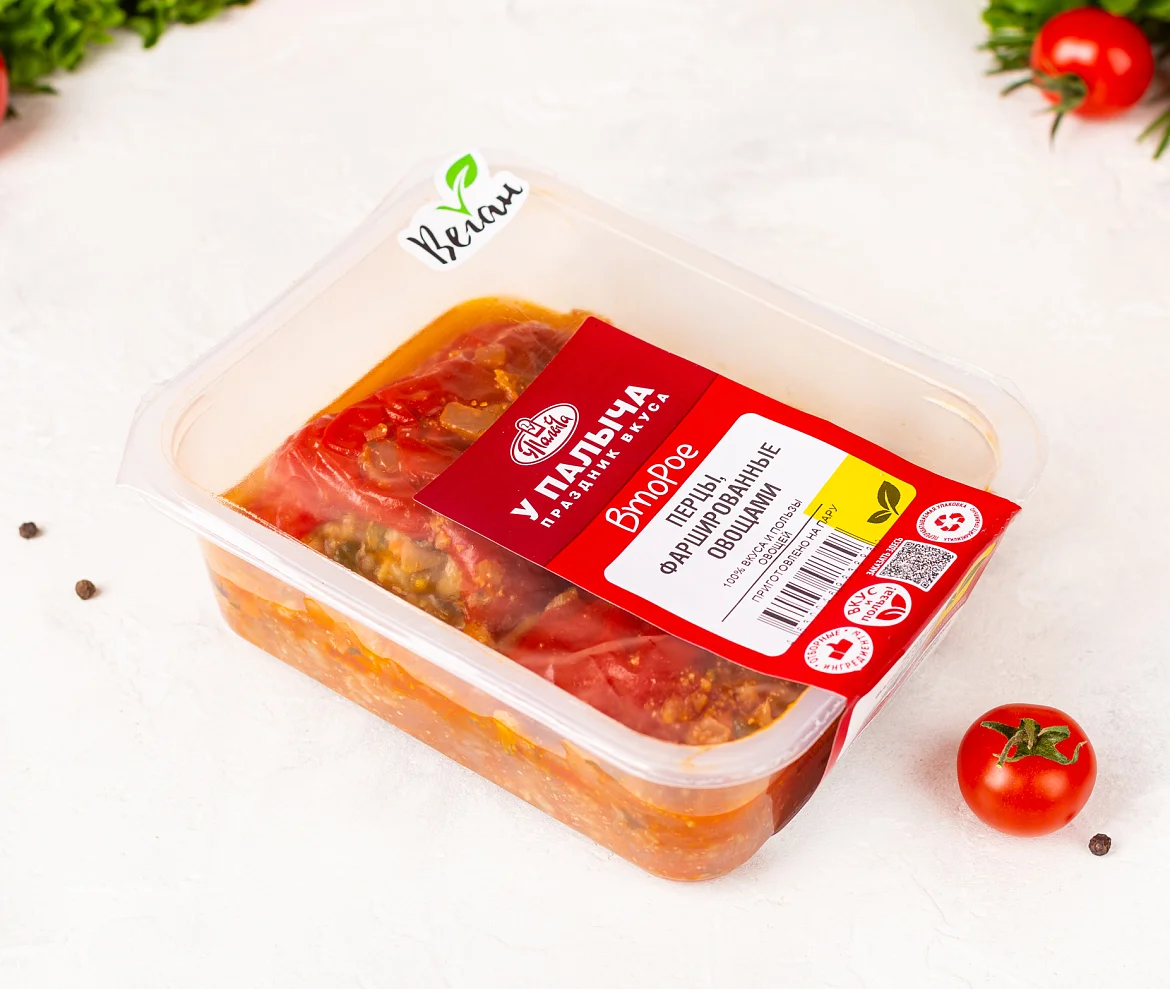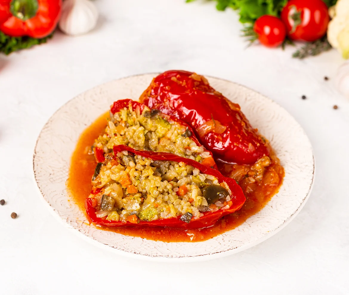 Чудесное постное блюдо для любителей овощей и веганов. Свежие болгарские перцы фаршированы ароматной начинкой из цветной капусты, брокколи, баклажанов и грибов с отборным краснодарским рисом. Полезный натуральный состав с заботой о здоровье и безопасности.