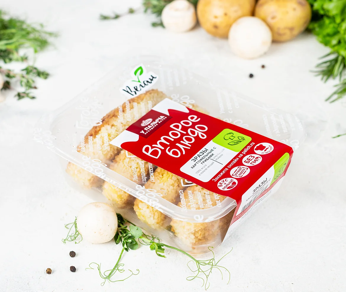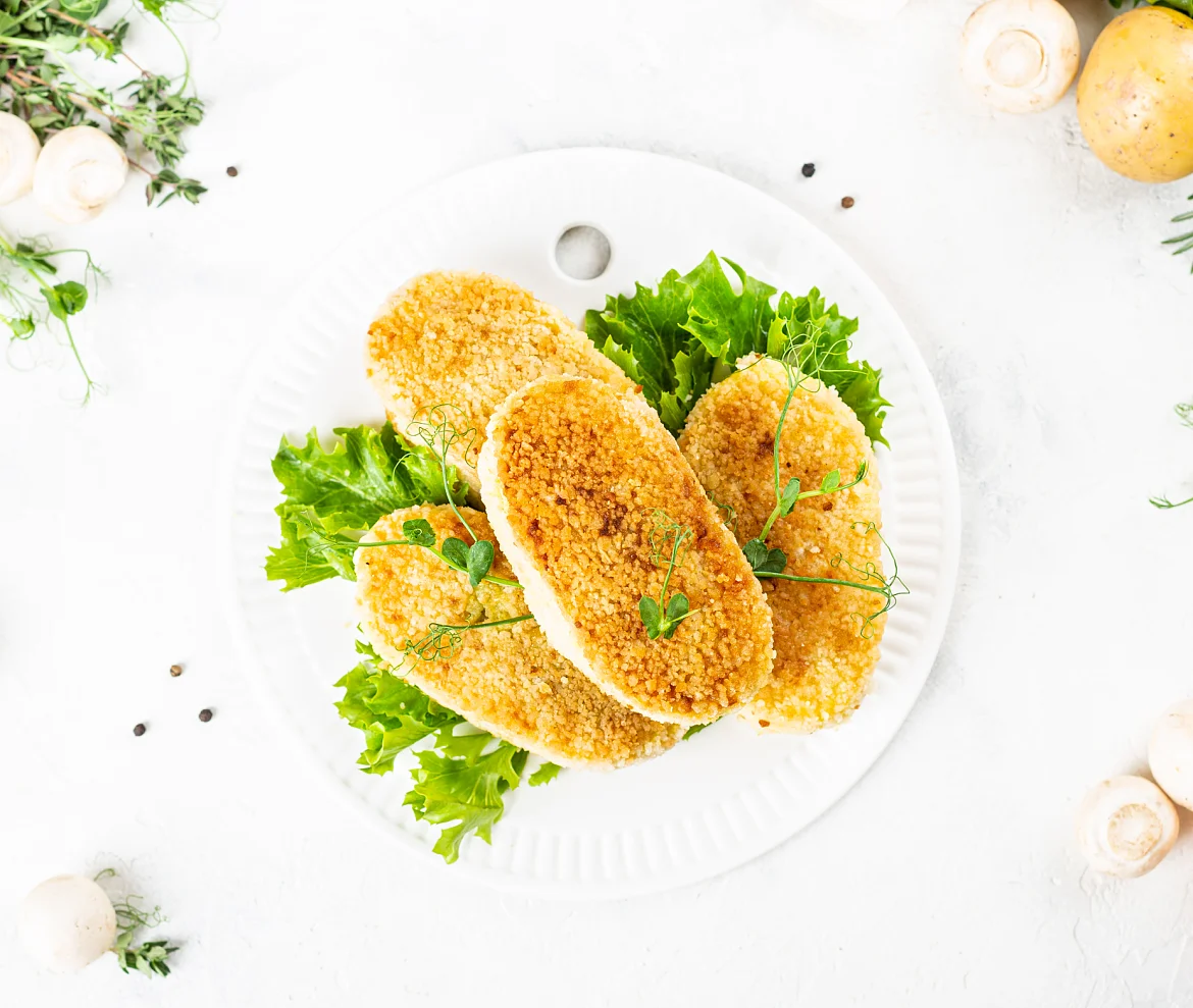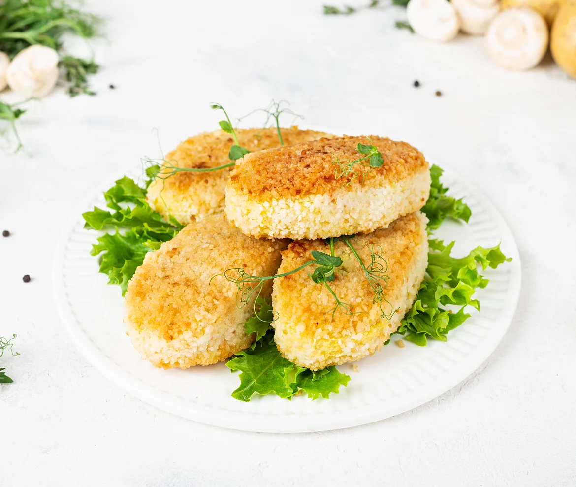 Картофель свежий, грибы шампиньоны свежие, масло подсолнечное рафинированное дезодорированное, сухари панировочные (мука пшеничная хлебопекарная в/с, вода питьевая, сахар, масло подсолнечное, соль, дрожжи хлебопекарные), лук репчатый свежий, крахмал картофельный, соль, чеснок свежий, перец черный молотый.