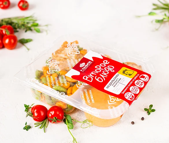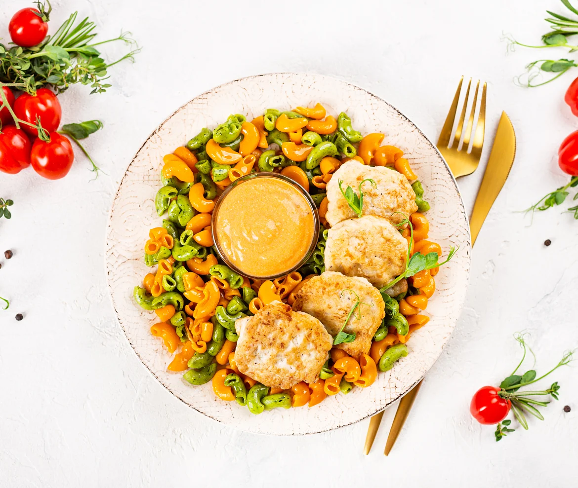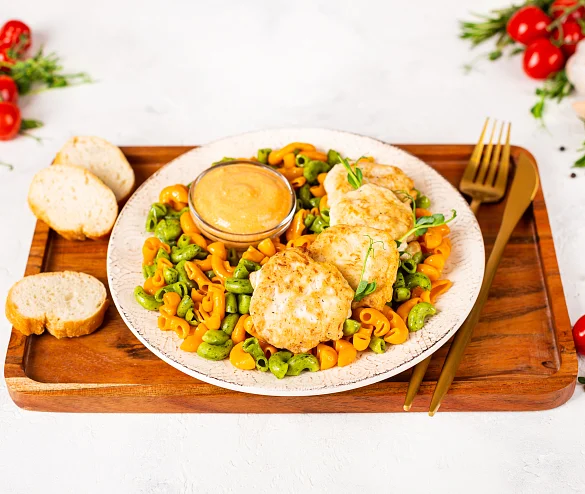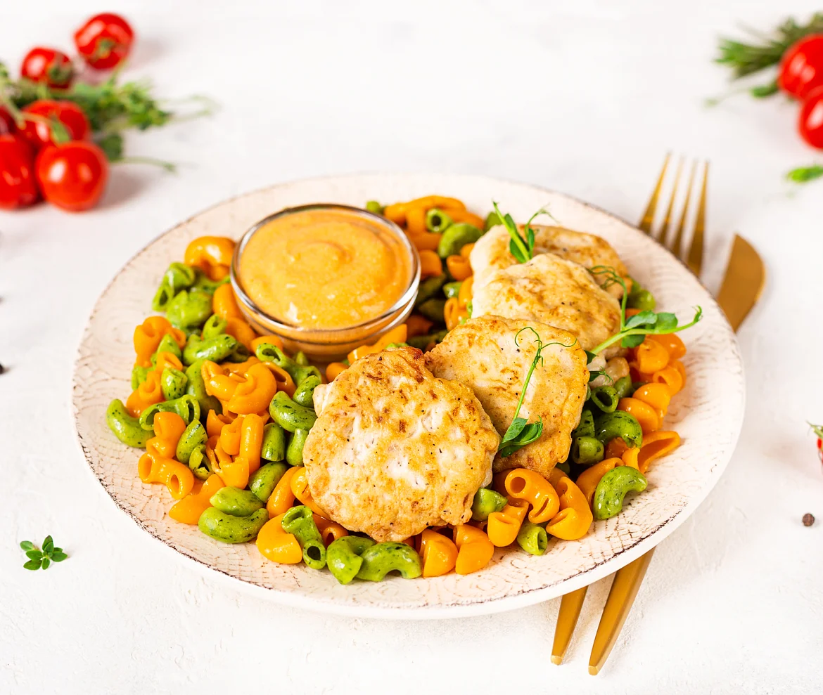 Маленькие ломтики рубленной куриной грудки в яйце, а на гарнир – яркие макарошки из твердых сортов пшеницы дурум с полезным шпинатом и спелыми томатами. Вкусное и веселое блюдо для любимых гурманов, уже готовое, в ресторанной подаче, нужно просто разогреть.