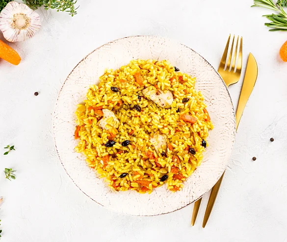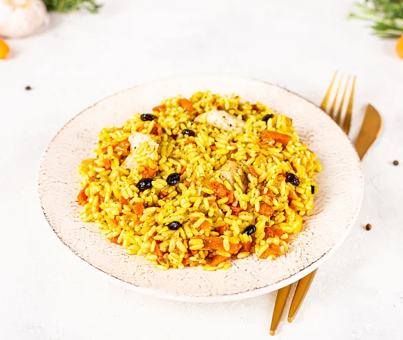 Вода очищенная, крупа рисовая, филе грудки цыплят-бройлеров б/к, лук репчатый свежий, морковь столовая свежая, масло подсолнечное рафинированное дезодорированное, соль, кумин семя, чеснок свежий, барбарис сушеный, куркума молотая, перец белый молотый. Произведено на предприятии, на котором также выпускаются продукты, содержащие арахис, горчицу, глютен, кунжут, моллюски, молоко, орехи, рыбу, сельдерей, сою, яйца.
