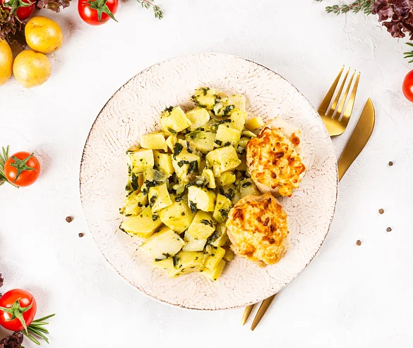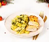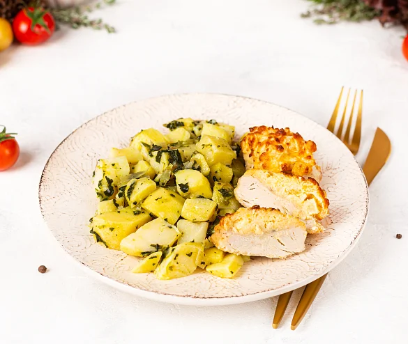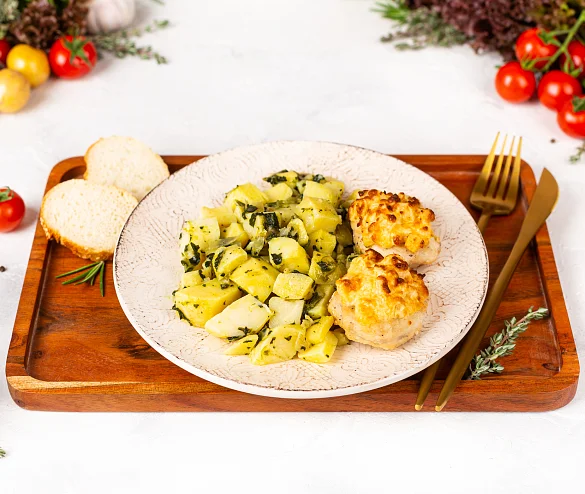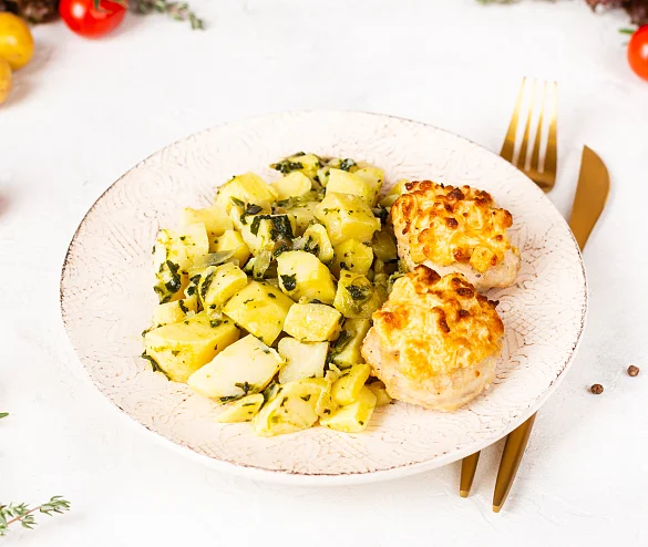 Нежнейшее филе куриной грудки, запеченное с ананасом, а на гарнир -молодой картофель, томленный в сливочном масле со шпинатом и репчатым лучком.
