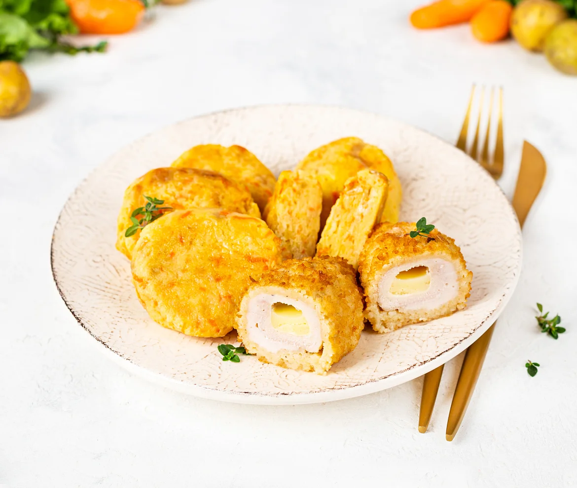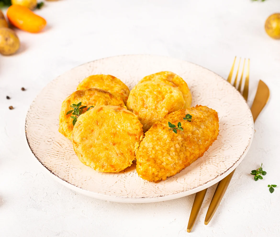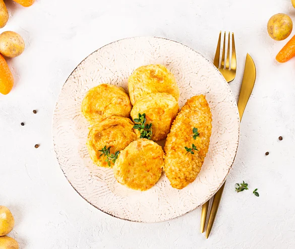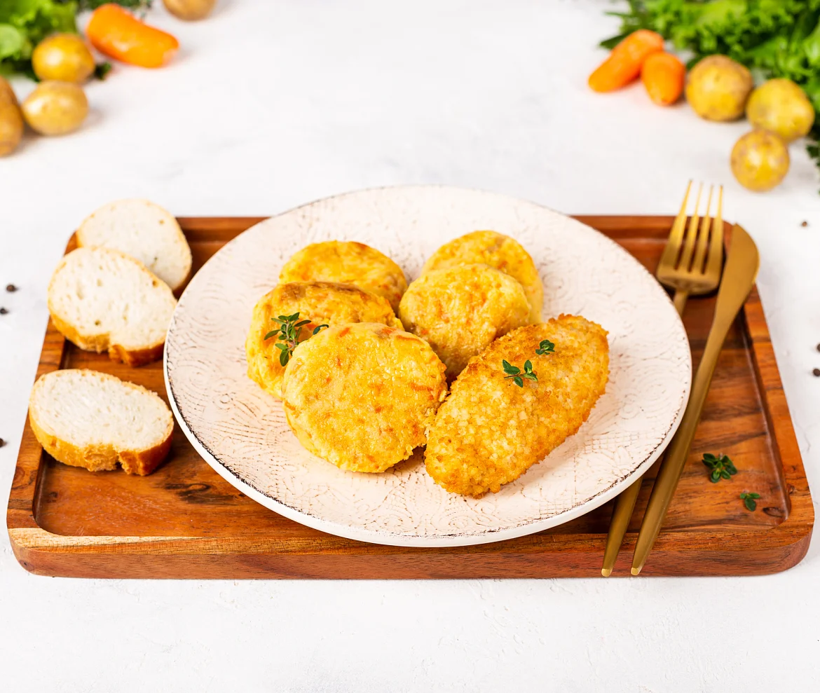 Картофель свежий, филе грудки куриное б/к, сухари панировочные (мука пшеничная в/с, вода, соль, дрожжи), морковь столовая свежая, лук репчатый свежий, масло подсолнечное рафинированное дезодорированное, яйцо куриное пищевое, мука пшеничная в/с, масло сливочное (сливки пастеризованные), молоко питьевое, соль, перец черный молотый.