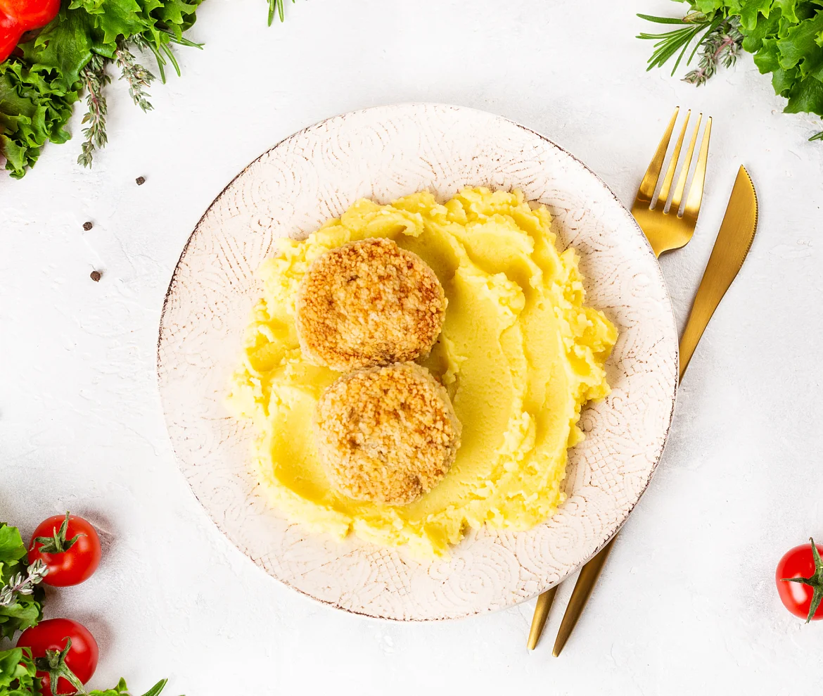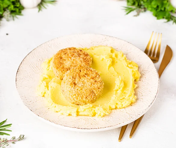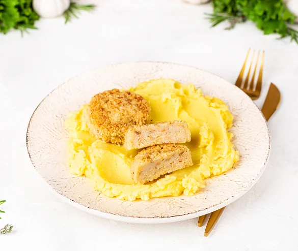 Биточки из нежного филе щуки и горбуши, приготовленные при низких температурах в хрустящей золотистой панировке с домашним картофельным пюре.