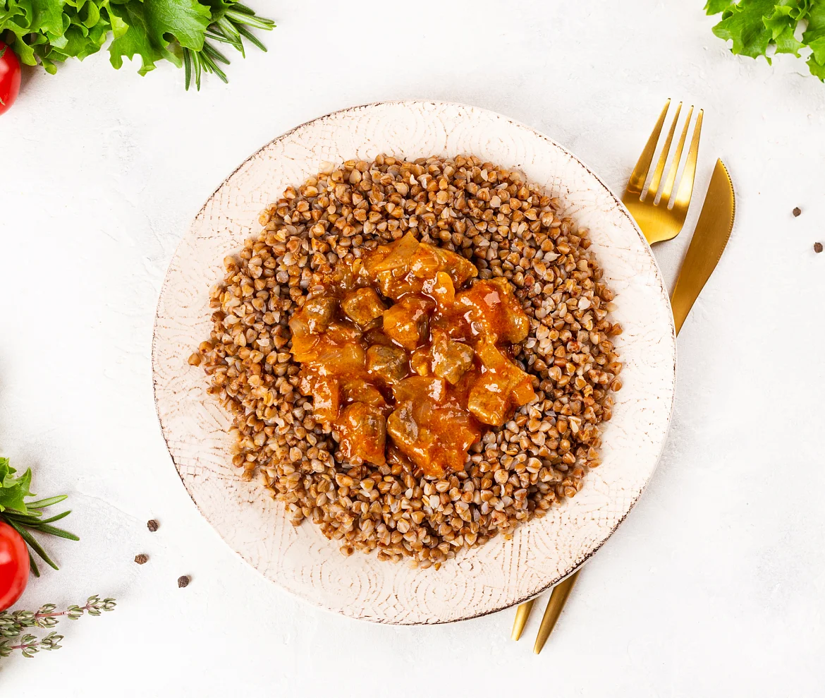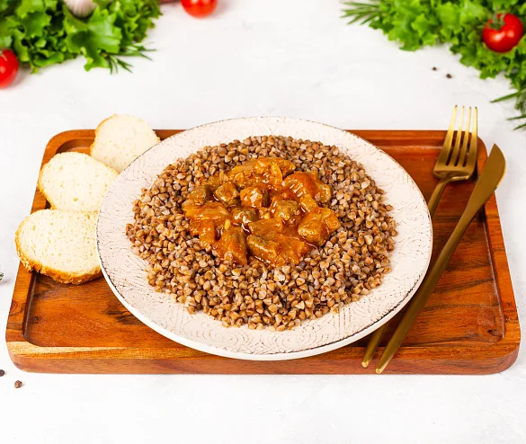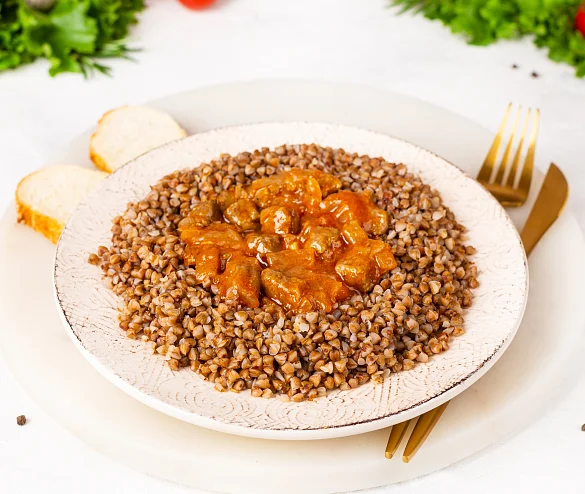 Специально отобранная говядина, тушеная в пикантном томатном соусе с ароматным чесночком и отварной гречневой крупой.