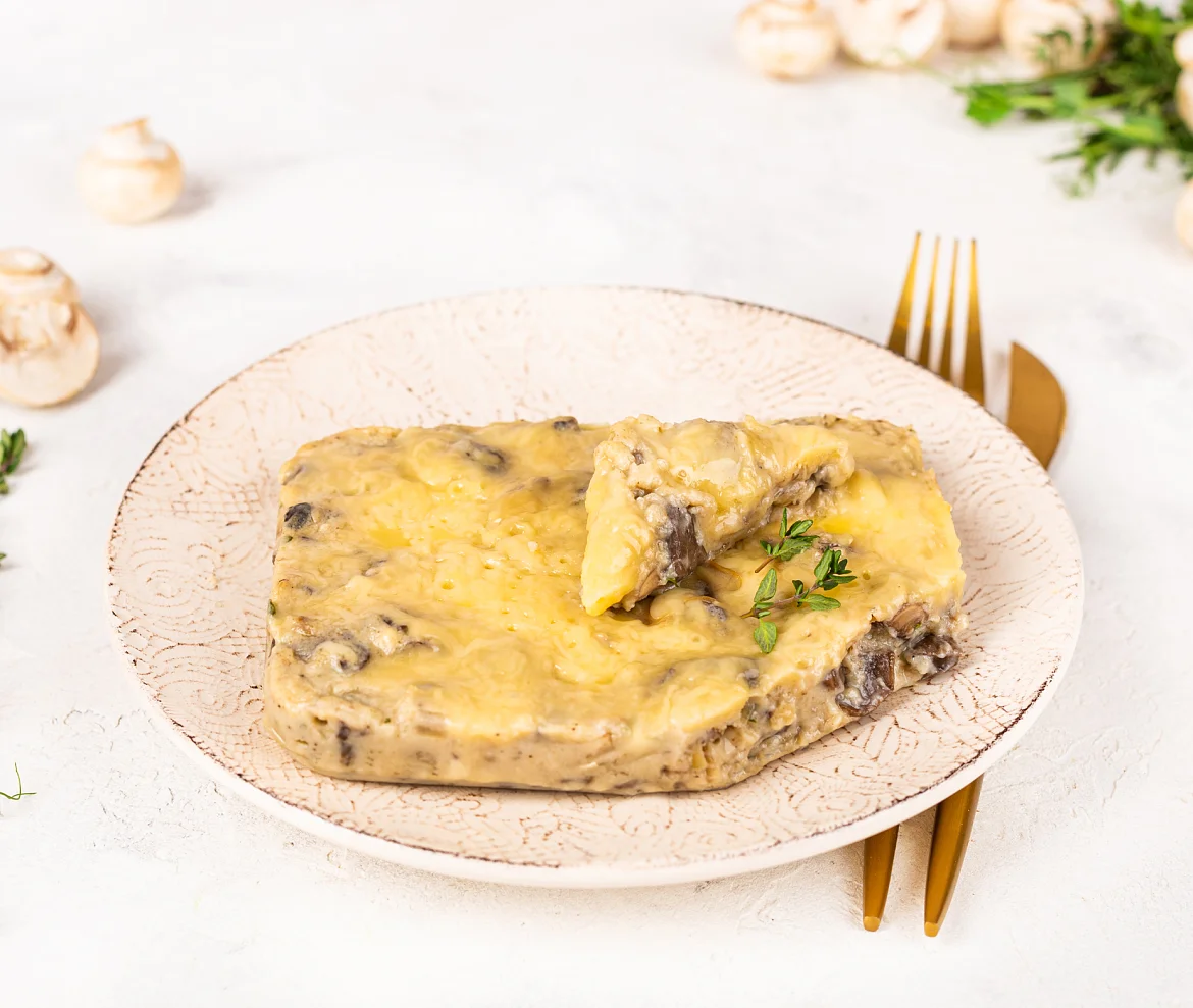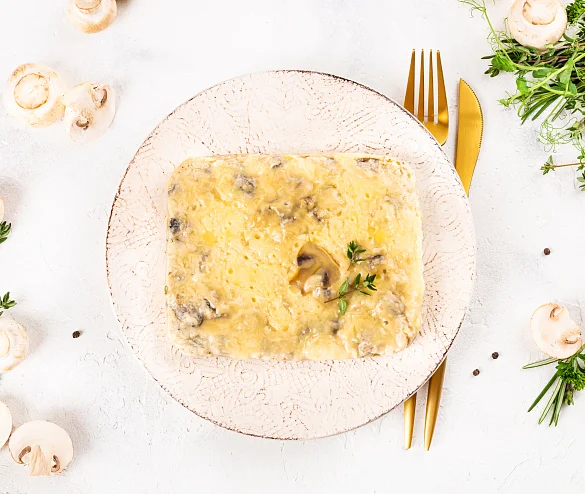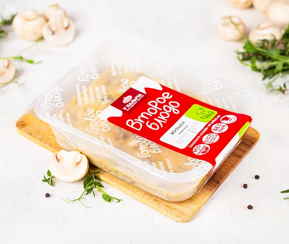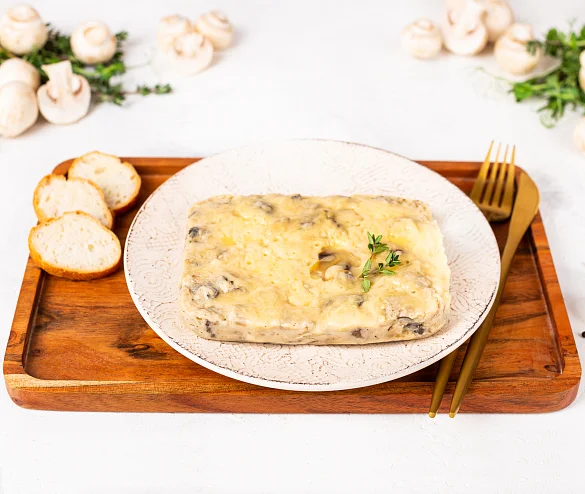 Сытное вегетарианское блюдо. Специально отобранные грибы обжариваются до румяной корочки с золотистым луком и затем запекаются с соусом Бешамель под румяной сырной шапкой. Время запекания — также важно, его мы контролируем особенно тщательно. Ещё один плюс: очень большая порция. Обычно жульен подают в маленьких кокотницах как закуску. Мы же предлагаем полноценное сытное и вкусное блюдо.
