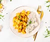 Картофель свежий, филе грудки куриное б/к, грибы шампиньоны свежие, масло подсолнечное рафинированное дезодорированное, молоко питьевое, сливки молочные (вода очищенная, масло сливочное, сухое обезжиренное молоко), вода очищенная, соус соевый (вода питьевая, соевые бобы, соль, пшеничная мука, сахар, краситель сахарный колер I простой), мука пшеничная в/с, масло сливочное (сливки пастеризованные), чеснок свежий, соль, уксус столовый, сахар, сухой яичный желток, сухое обезжиренное молоко, паприка сладкая молотая, перец черный молотый, перец белый молотый, нерафинированное горчичное масло.