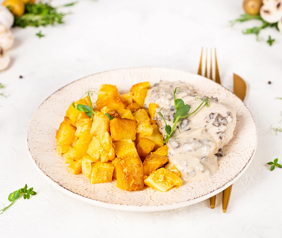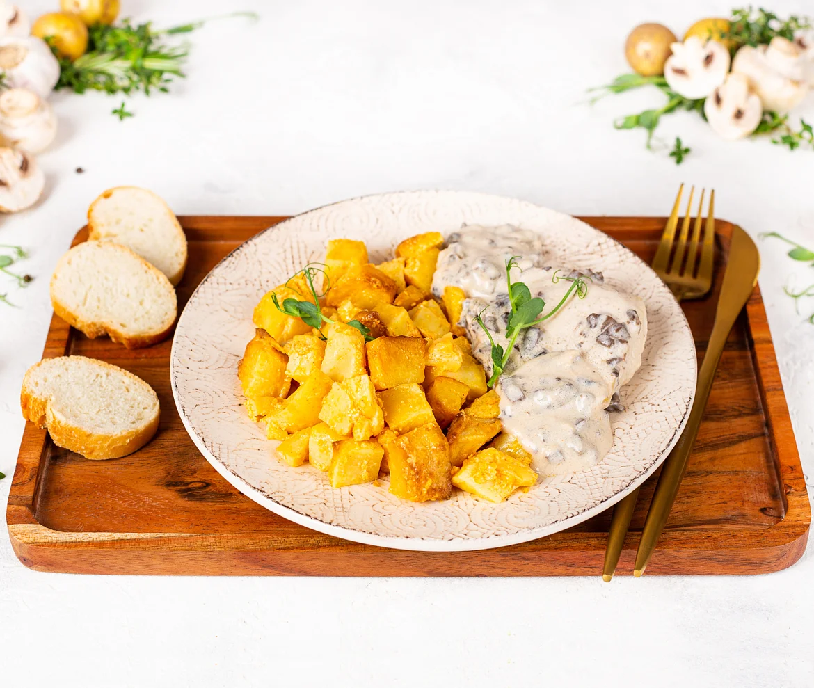 Главная особенность этого блюда в обратном эффекте. Здесь основной элемент — это отборные куриные грудки под соусом из свежих шампиньонов и натуральных сливок, приготовленные на пару. Основной элемент имеет сдержанный нежный вкус. А гарнир, наоборот, добавляет насыщенности вкусу. Это запечённый на противне картофель в специях.