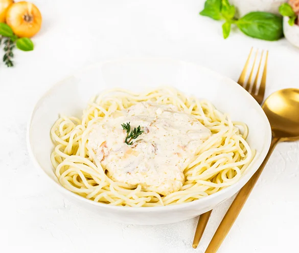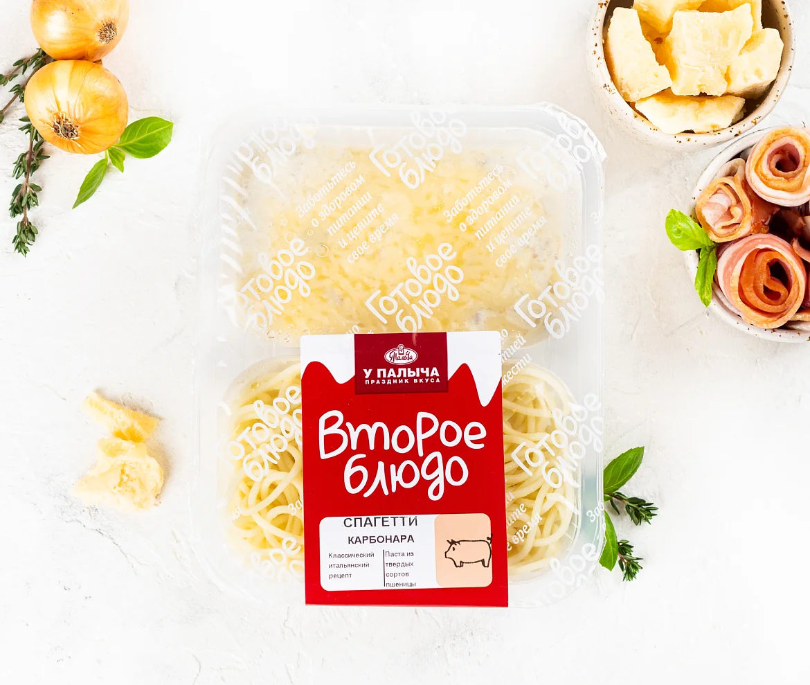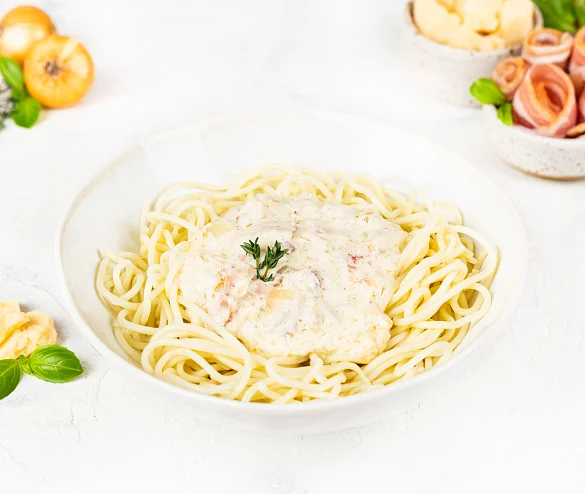 Вода очищенная, спагетти (мука из твердых сортов пшеницы в/с, вода очищенная), сливки молочные (вода очищенная, масло сливочное, сухое обезжиренное молоко), бекон с/к (свинина, вода, нитритно-посолочная смесь (соль, фиксатор окраски нитрит натрия), регуляторы кислотности трифосфат и пирофосфат натрия, перец черный), лук репчатый свежий, сыр Пармезан (молоко цельное, молоко обезжиренное, соль, заквасочные термофильные культуры микробного происхождения, уплотнитель хлорид кальция), сыр Российский (молоко пастеризованное, закваска мезофильных и термофильных молочнокислых микроорганизмов, молокосвёртывающий ферментный препарат животного происхождения, соль, уплотнитель хлорид кальция), масло подсолнечное рафинированное дезодорированное, крахмал картофельный, соль, перец черный молотый.