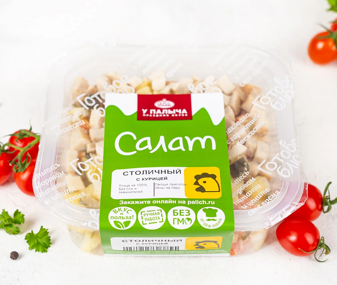 Изысканный салат для любителей нежного куриного филе. Сбалансированное сочетание ломтиков куриной грудки, маринованных огурчиков, отварного картофеля под вкуснейшим соусом - секрет оригинального рецепта. В салат уже добавлен вкуснейший майонез из натуральных ингредиентов от Палыча. Чтобы насладиться гармоничным вкусом, салат нужно перемешать.