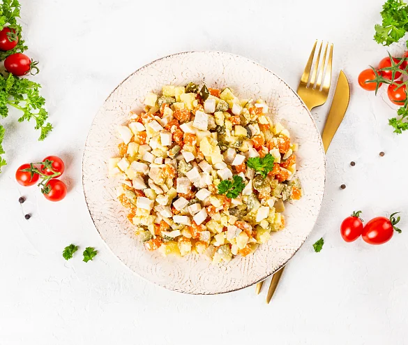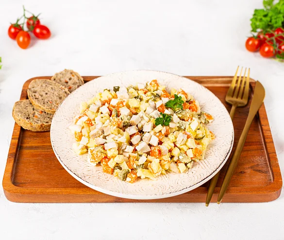 Картофель свежий, яйцо куриное пищевое, филе грудки куриное б/к, огурцы маринованные (огурцы, вода, сахар, соль, регулятор кислотности уксусная кислота, зелень укропа, лук), морковь столовая свежая, лук репчатый свежий, соевый соус (вода питьевая, соевые бобы, соль, пшеничная мука, сахар, краситель натуральный сахарный колер I простой), масло подсолнечное рафинированное дезодорированное, чеснок свежий, соль, уксус столовый, сахар, сухой яичный желток, сухое обезжиренное молоко, нерафинированное горчичное масло, перец черный молотый.